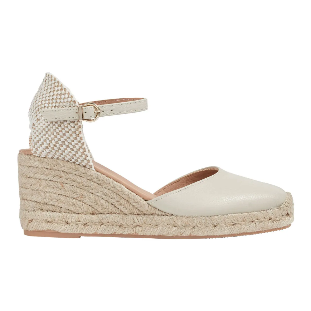 - Rope wedge sole, round leather toe, ankle strap, gold-tone buckle fastening, canvas back