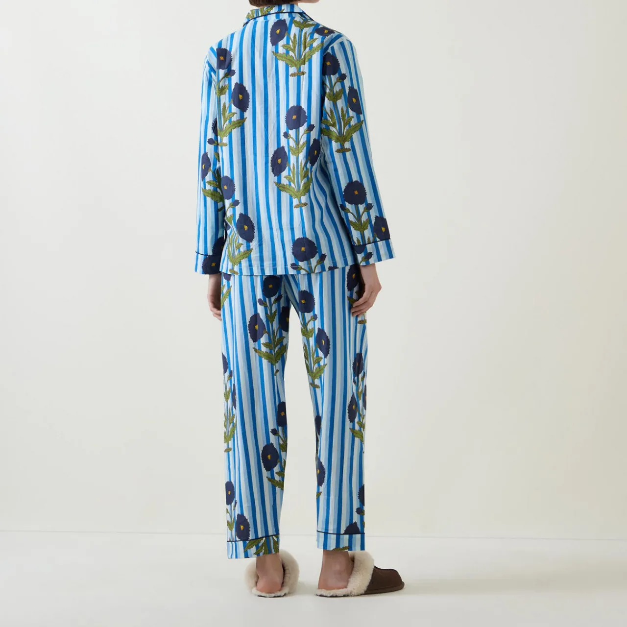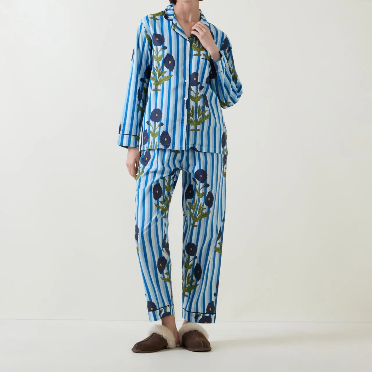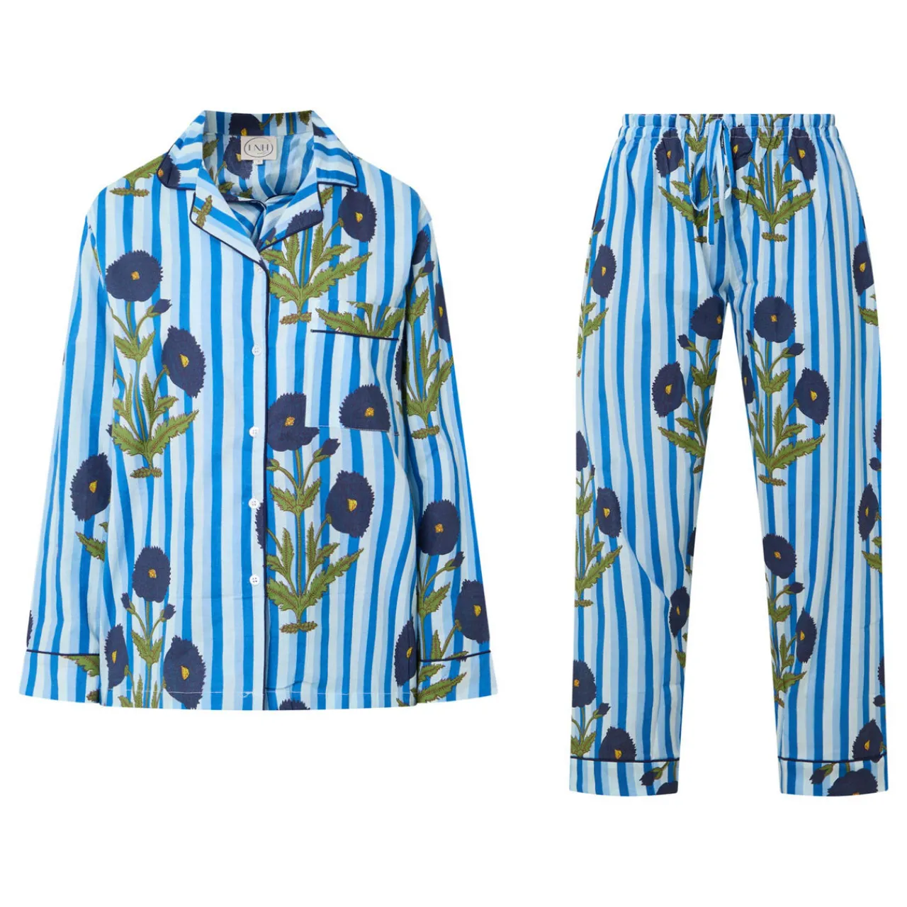 - Top: Notched lapels, button fastening, long sleeves, chest patch pocket, piped details, stripe and floral pattern. Bottoms: Elasticated waistband with drawstring adjustable fit, piped details, stripe and floral pattern