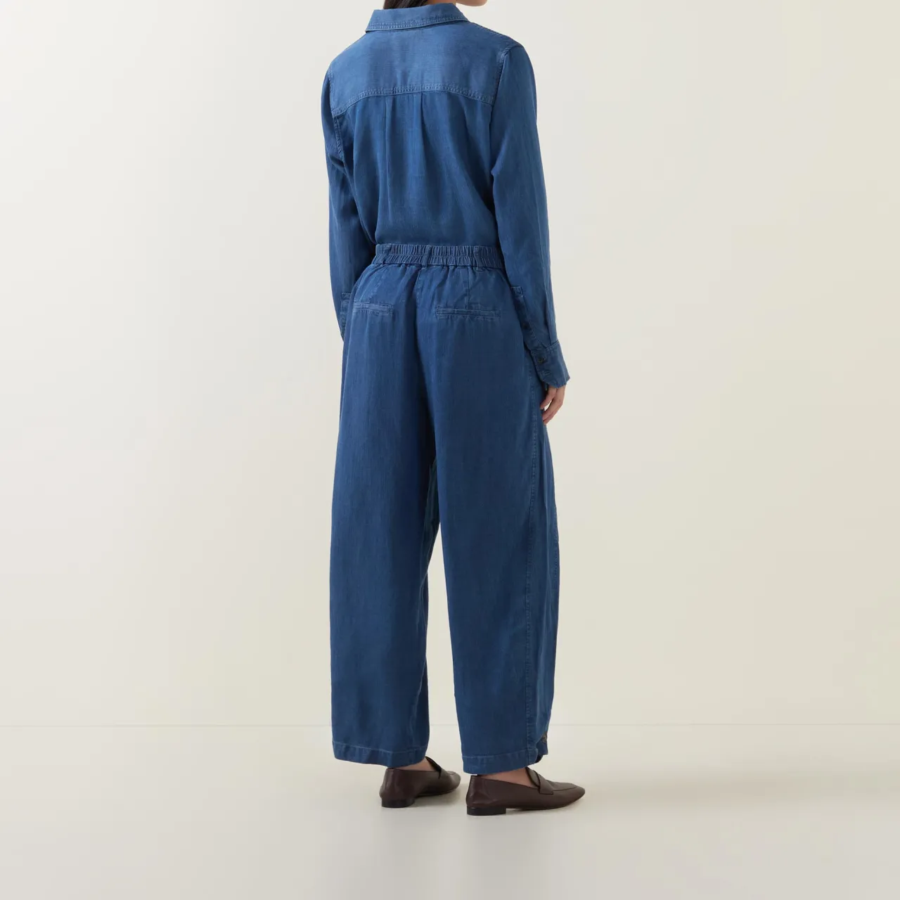 - Mid-rise, barrel leg, belt loops, rear elasticated waistband, concealed fly and button fastening, front pleats, two side seam pockets, two rear welt pockets, adjustable cuffs, tobacco stitching, soft mid-wash finish