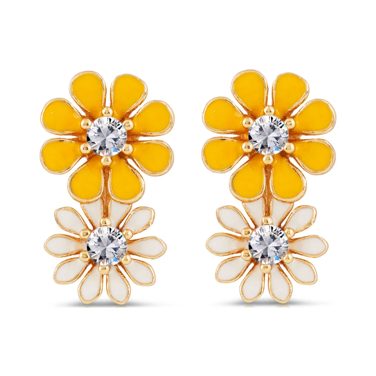 - Yellow and white enamel details, centre crystal embellishment, stud post fastening, butterfly back clasps, polished gold plated finish, presented in signature Newbridge Silverware gift box