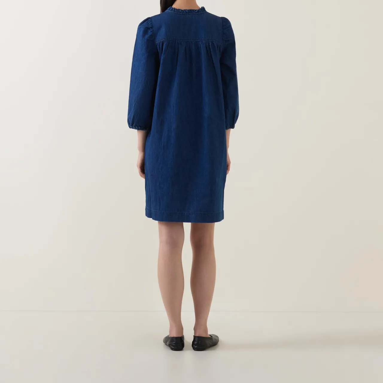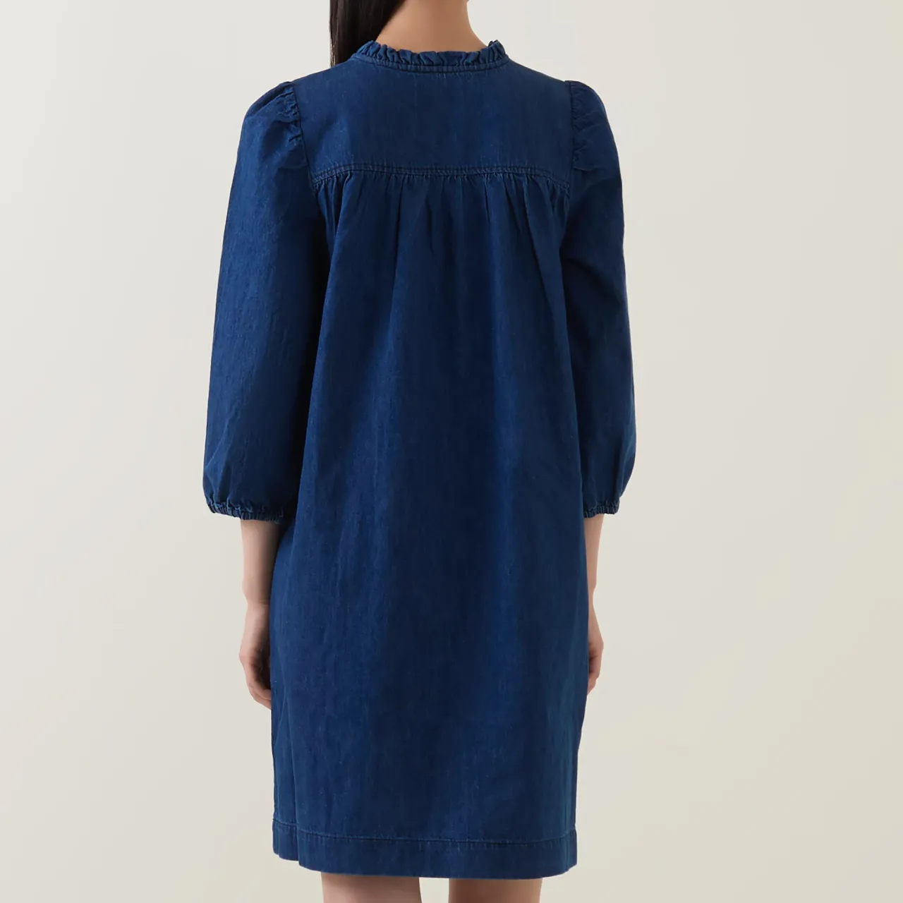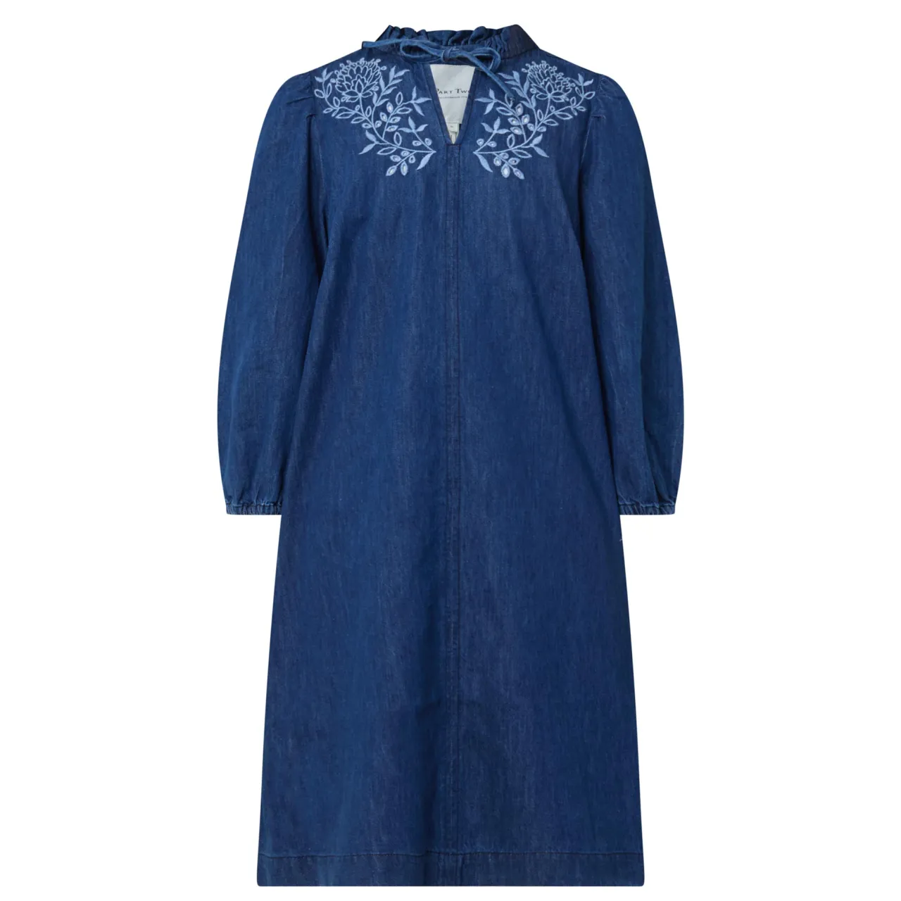 - Frill collar, notched neckline with self-tie detail, mini length, three-quarter-length sleeves, elasticated cuffs, embroidered details
