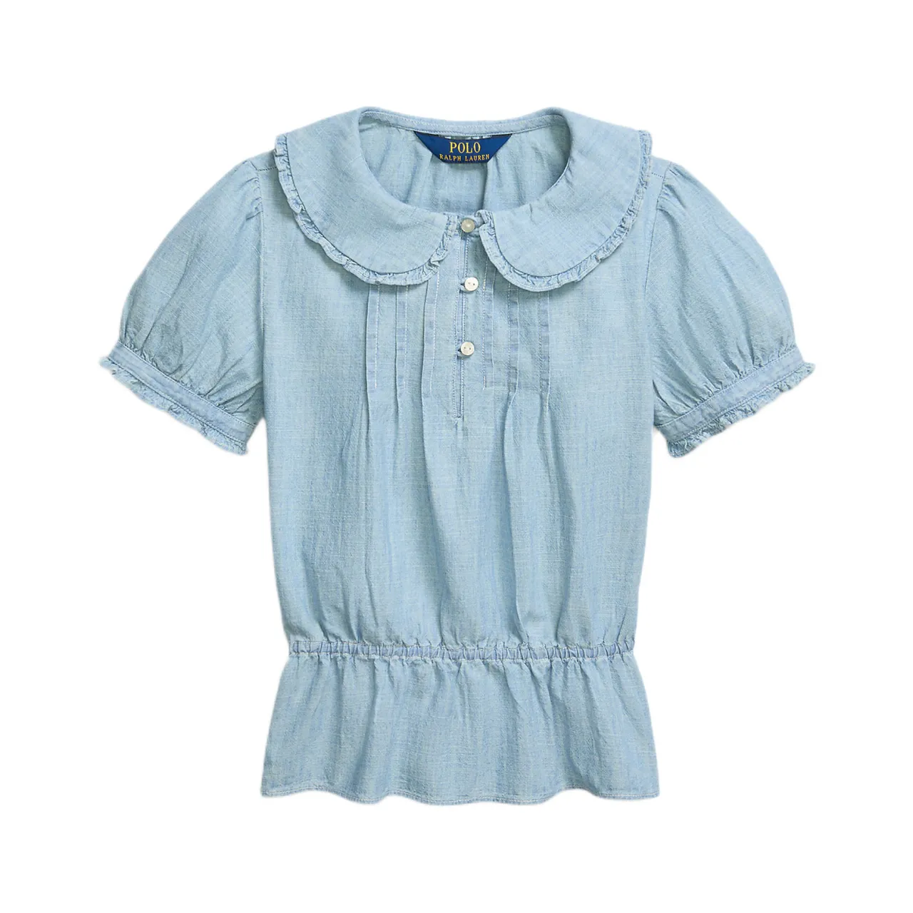 - Peter Pan collar with ruffle trim, three-button placket, puffed short sleeves, buttoned armbands with ruffle trim, pintucks along the bodice, elasticised waist, peplum hem, multicoloured signature embroidered Pony at the right hem
