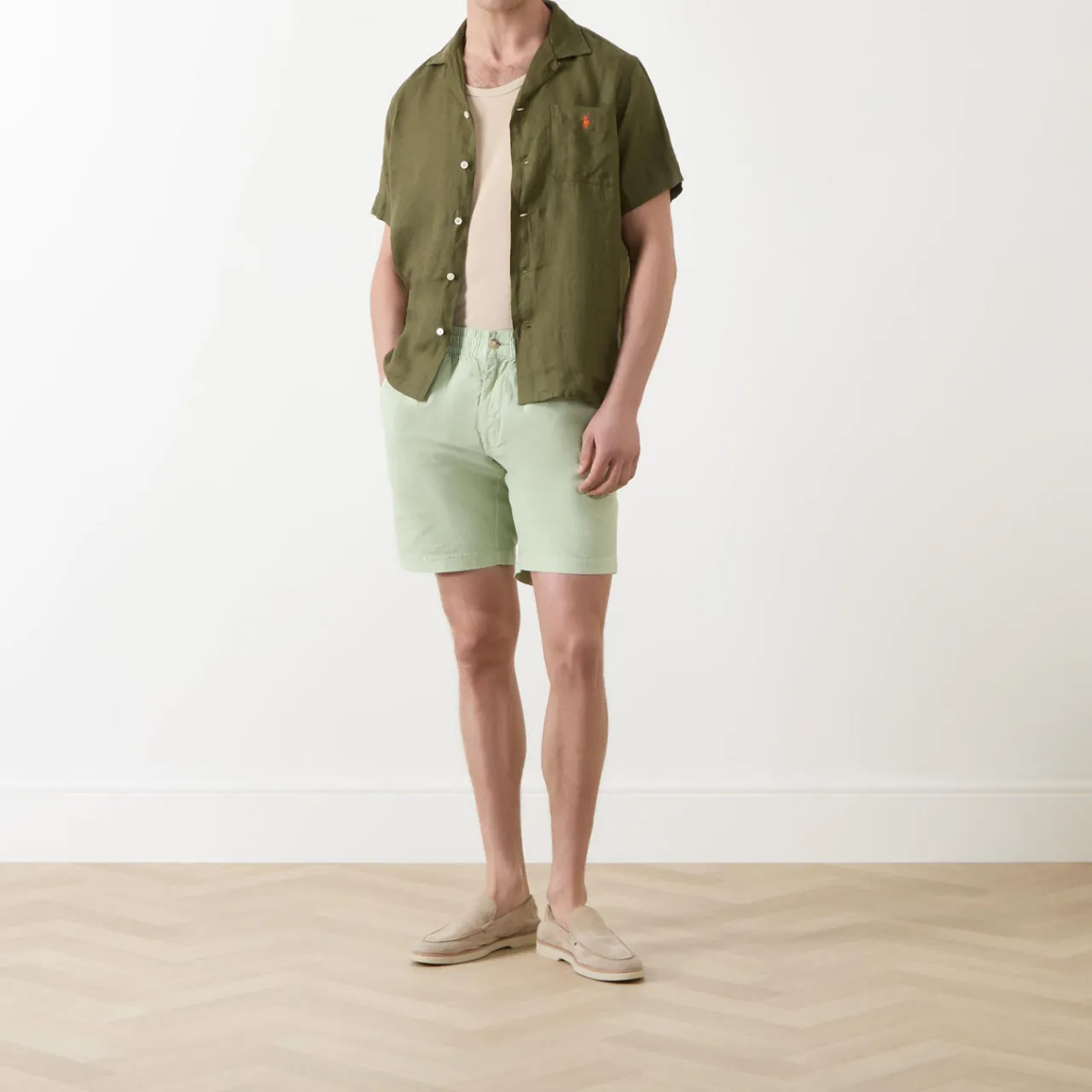 - Mid-rise, straight leg, elasticated waistband, concealed fly and button fastening, two side entry pockets, one rear flap pocket and one rear welt pocket with button fastenings, clean hems, rear polo player logo embroidery, mineral-dyed finish