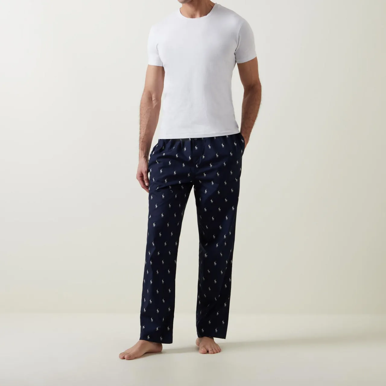 - All-over pony logo, elasticated waistband, tie fastening, button fly, side pockets