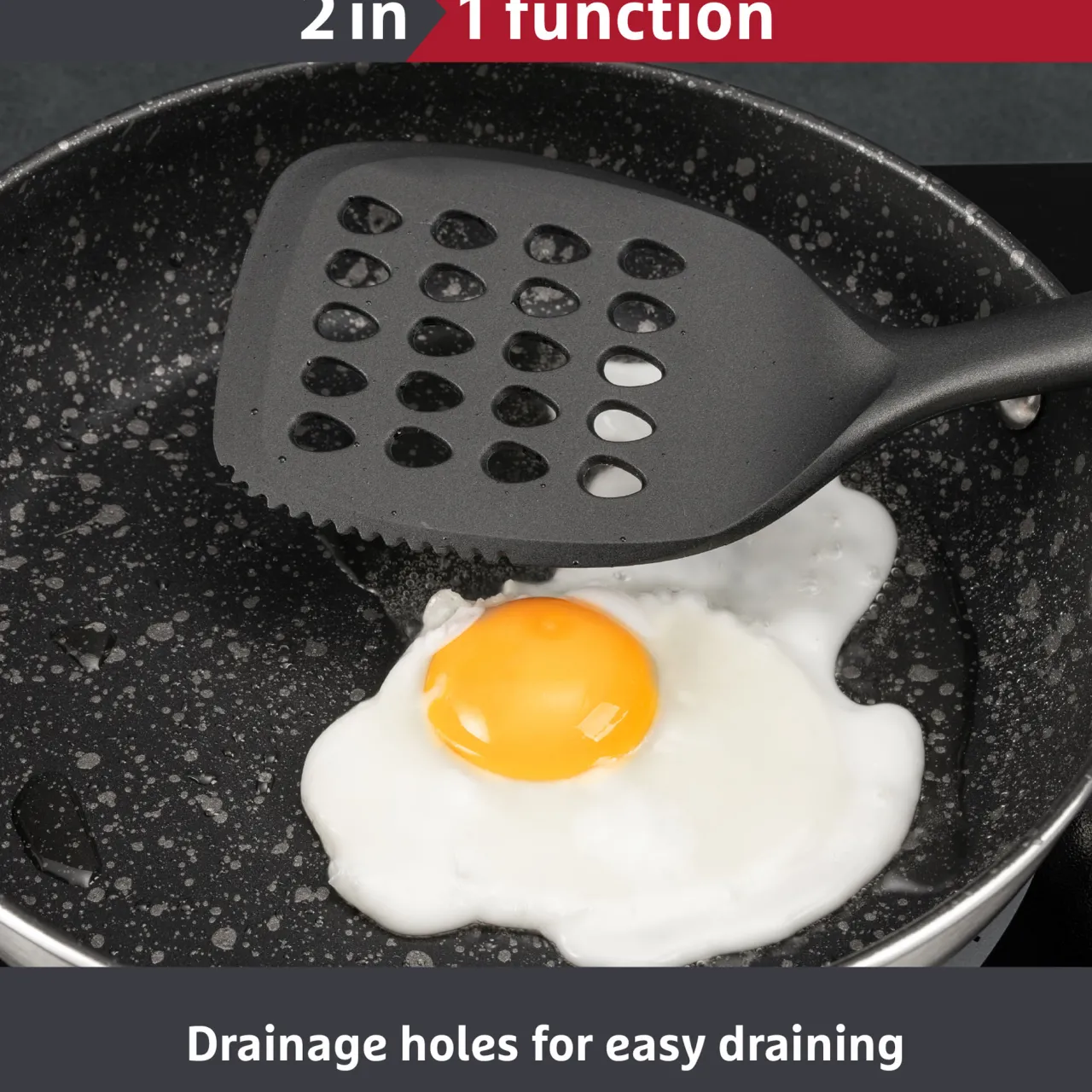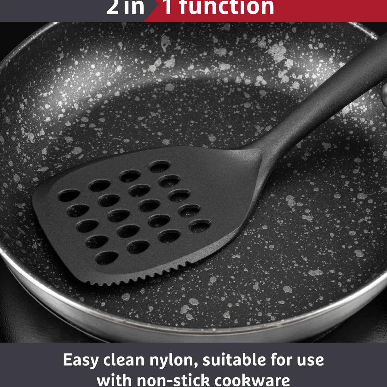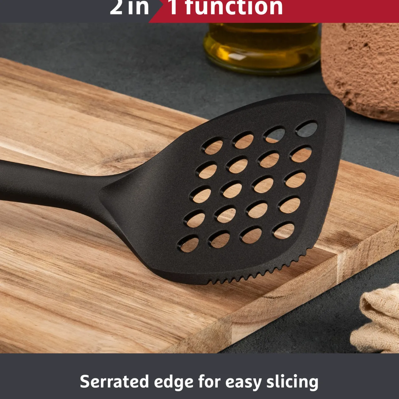 - Slotted head allows for quick drainage of oils and liquids, serrated edge adds cutting functionality, heat resistant up to 210° for stovetop use, ergonomic soft-touch handle for comfort and control, dishwasher safe for effortless cleaning, lightweight yet durable for everyday use