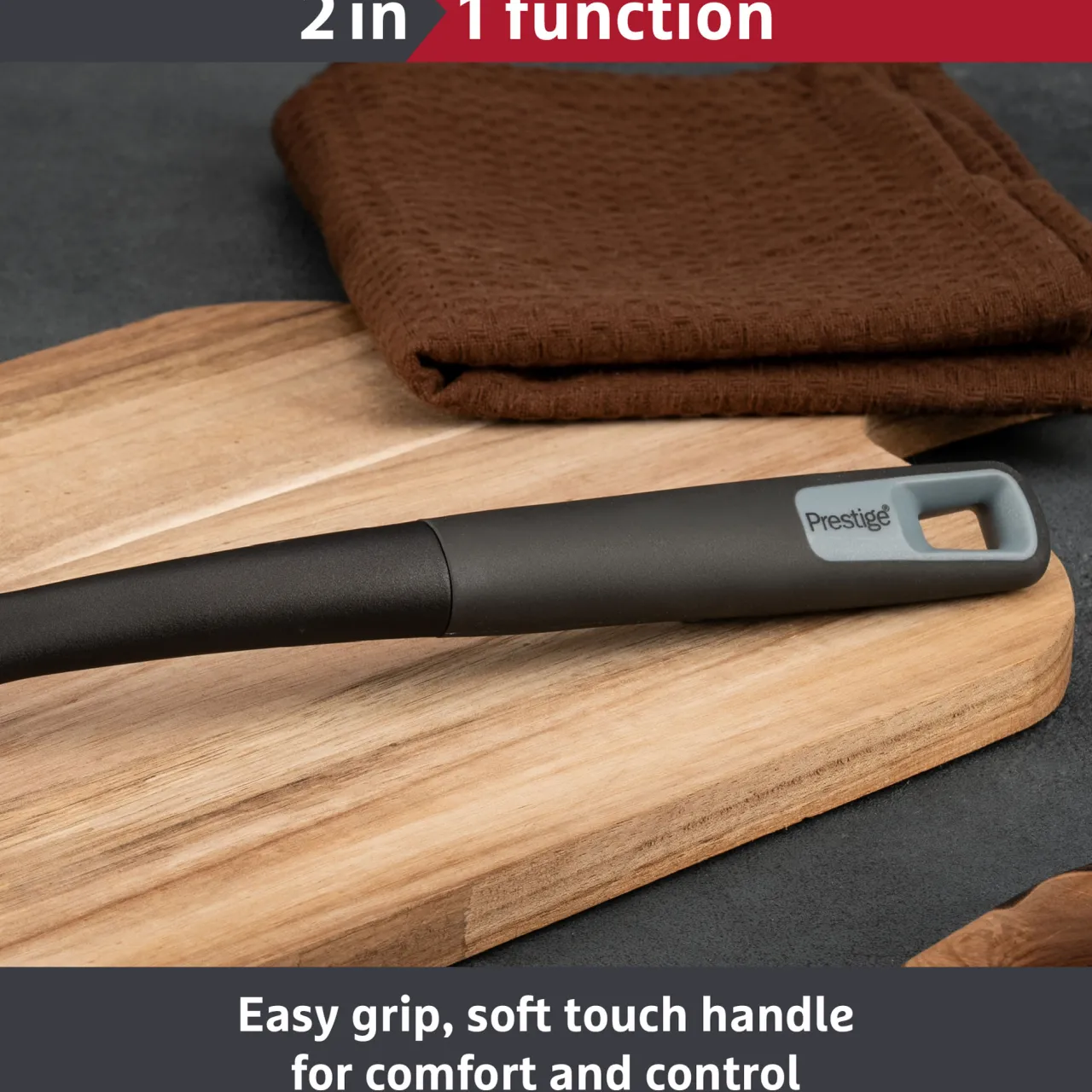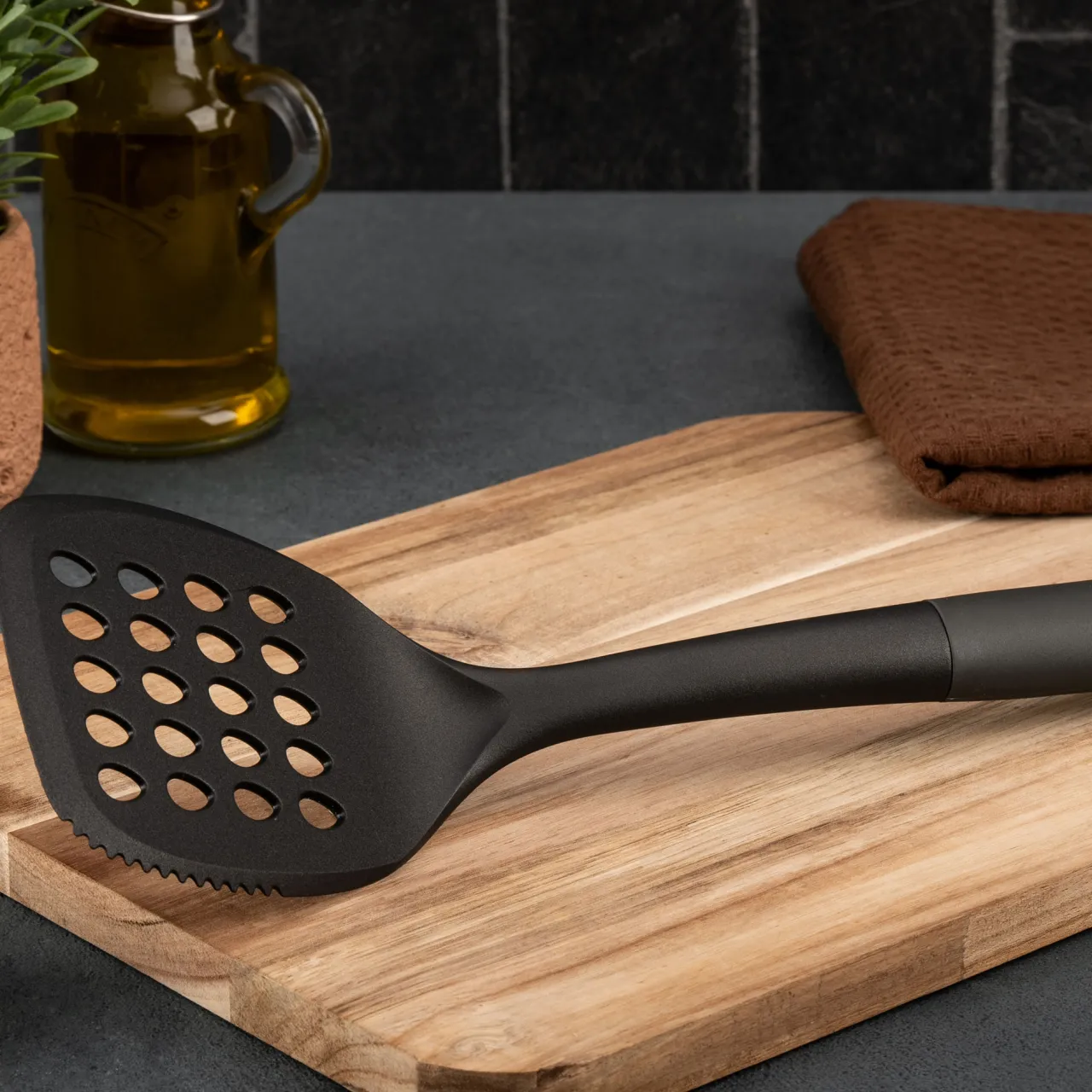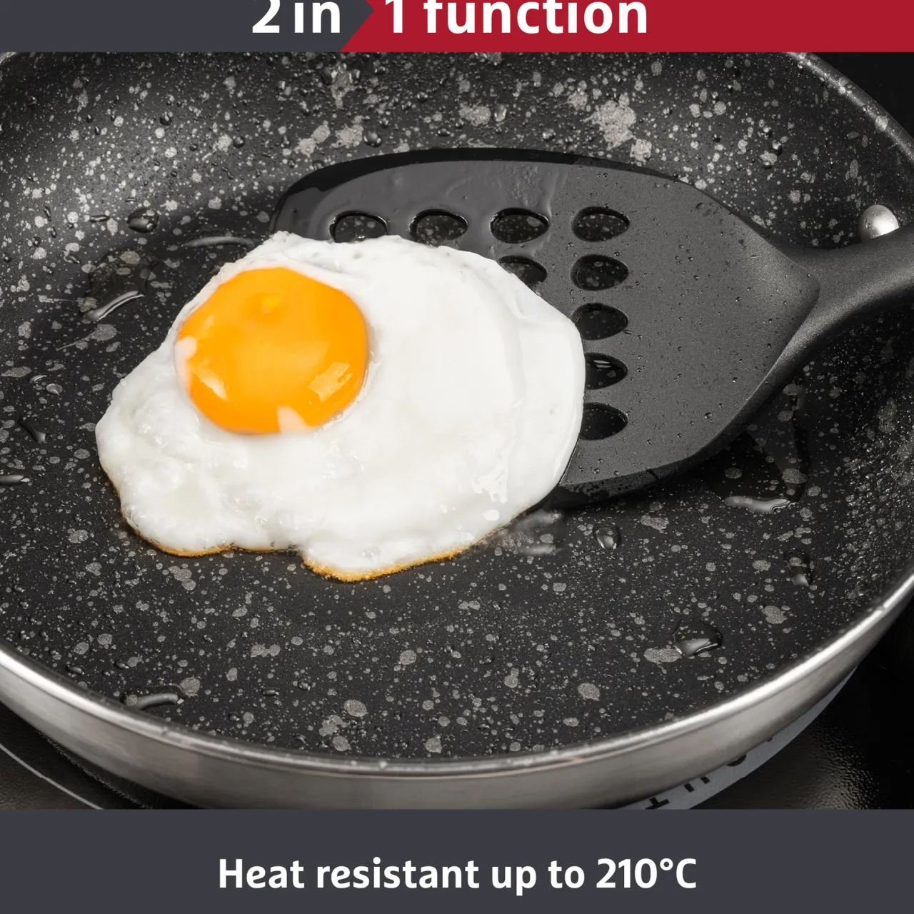 - Slotted head allows for quick drainage of oils and liquids, serrated edge adds cutting functionality, heat resistant up to 210° for stovetop use, ergonomic soft-touch handle for comfort and control, dishwasher safe for effortless cleaning, lightweight yet durable for everyday use