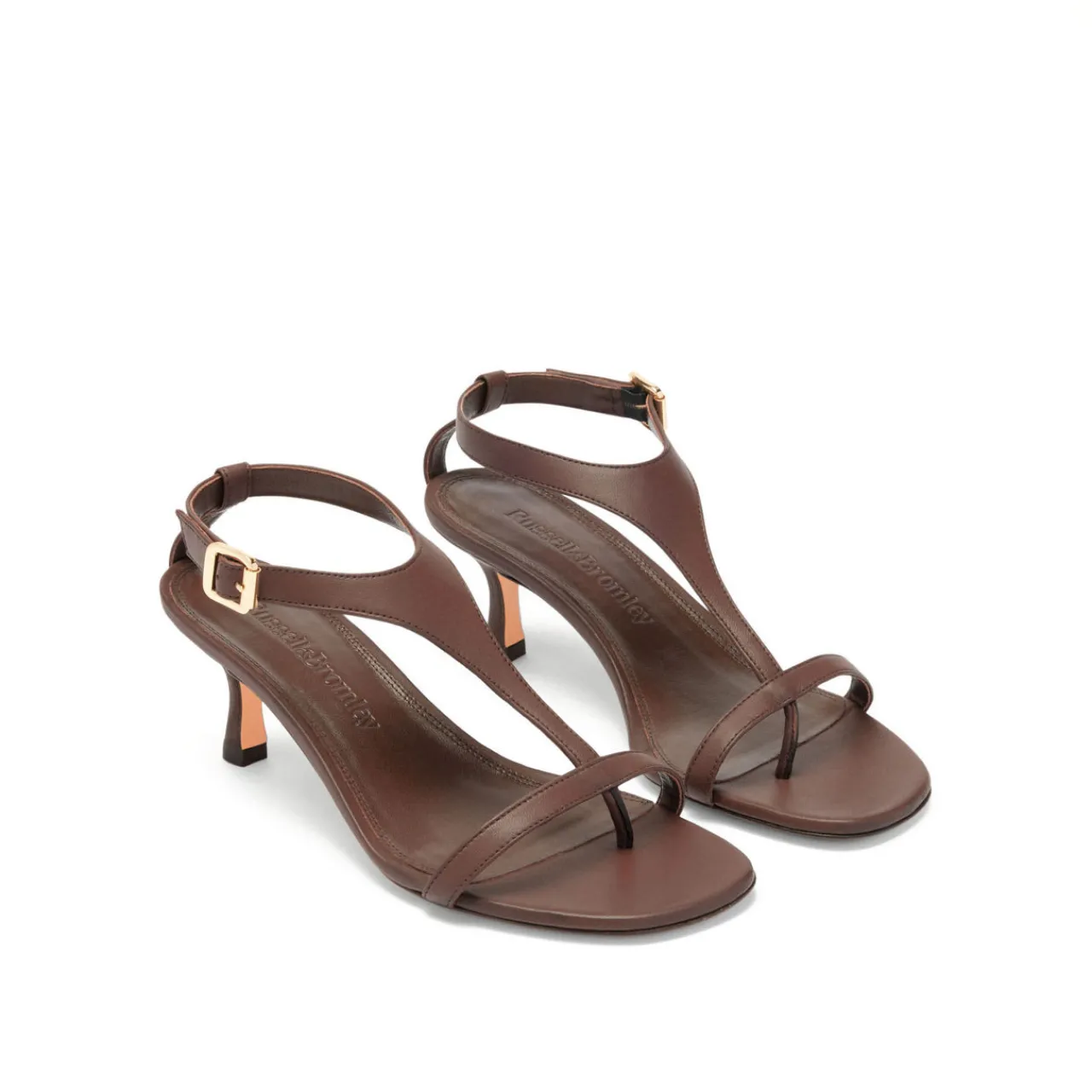 - T-bar design, adjustable buckle strap, heeled sandal, leather