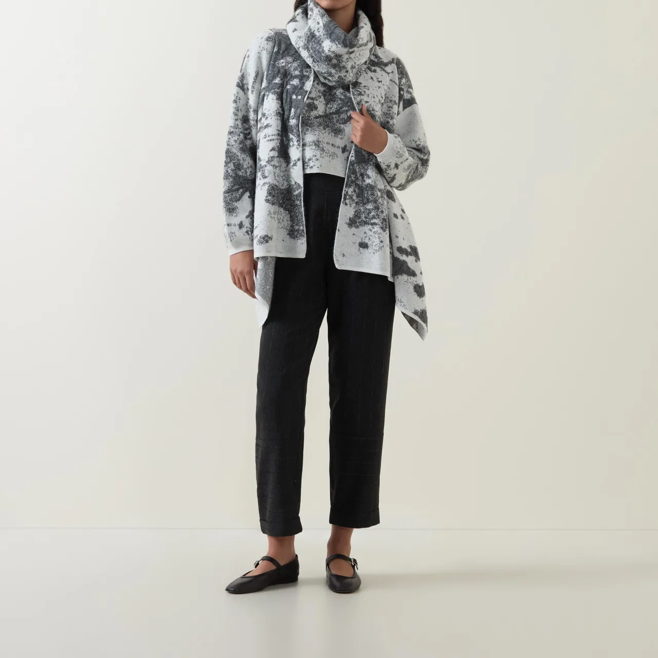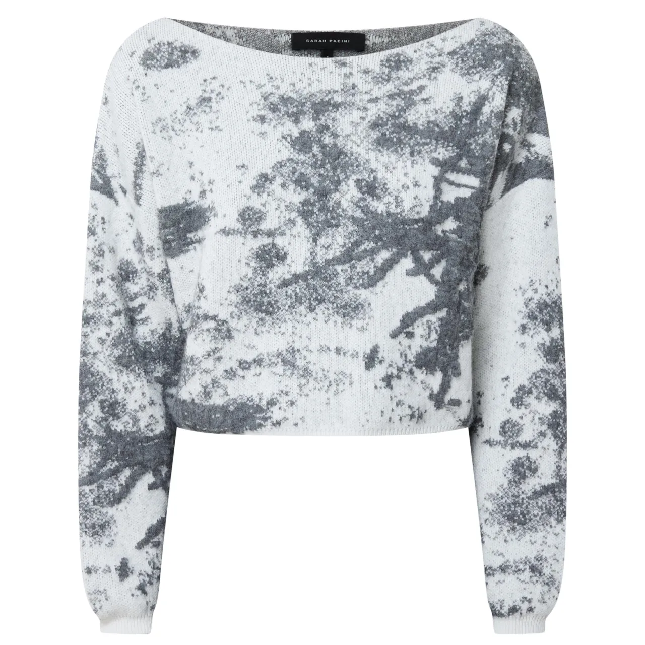 - Boat neckline, long sleeves, dropped shoulders, cropped length, textured knit structure, printed, fine ribbed trims