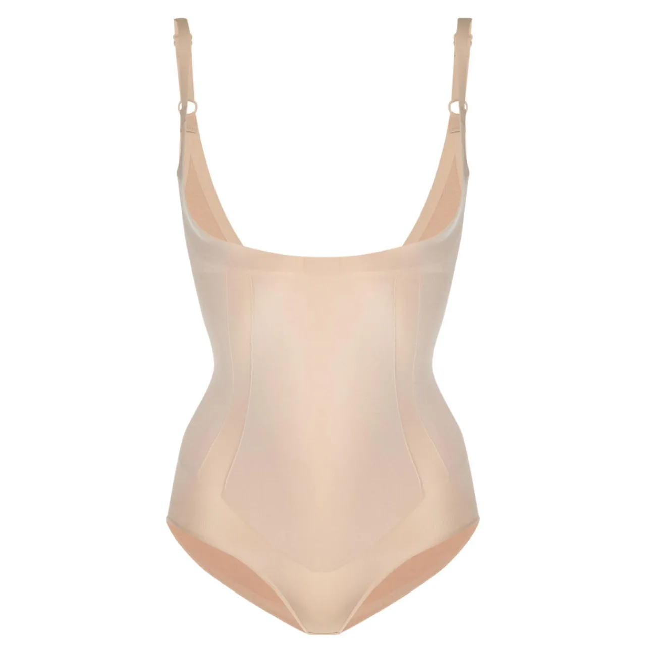 - Brief style base, hook and eye fastenings, comfortable sculpting power with less bulk, bonded tummy panel flat-out flattens, side panels offer easy movement, open-bust accommodates most bust sizes and you can wear your own bra, high-stretch finish, comfortable back and underarm smoothing, adjustable straps, high waisted designed for great coverage and no muffin top, soft, elastic-free stay put waistband with a no-slip stripe = no digging, pinching or rolling, bottom enhancing pockets for the best-looking bottom, this design leaves underwear optional and eliminates visible panty lines, hook and eye closure on the base
