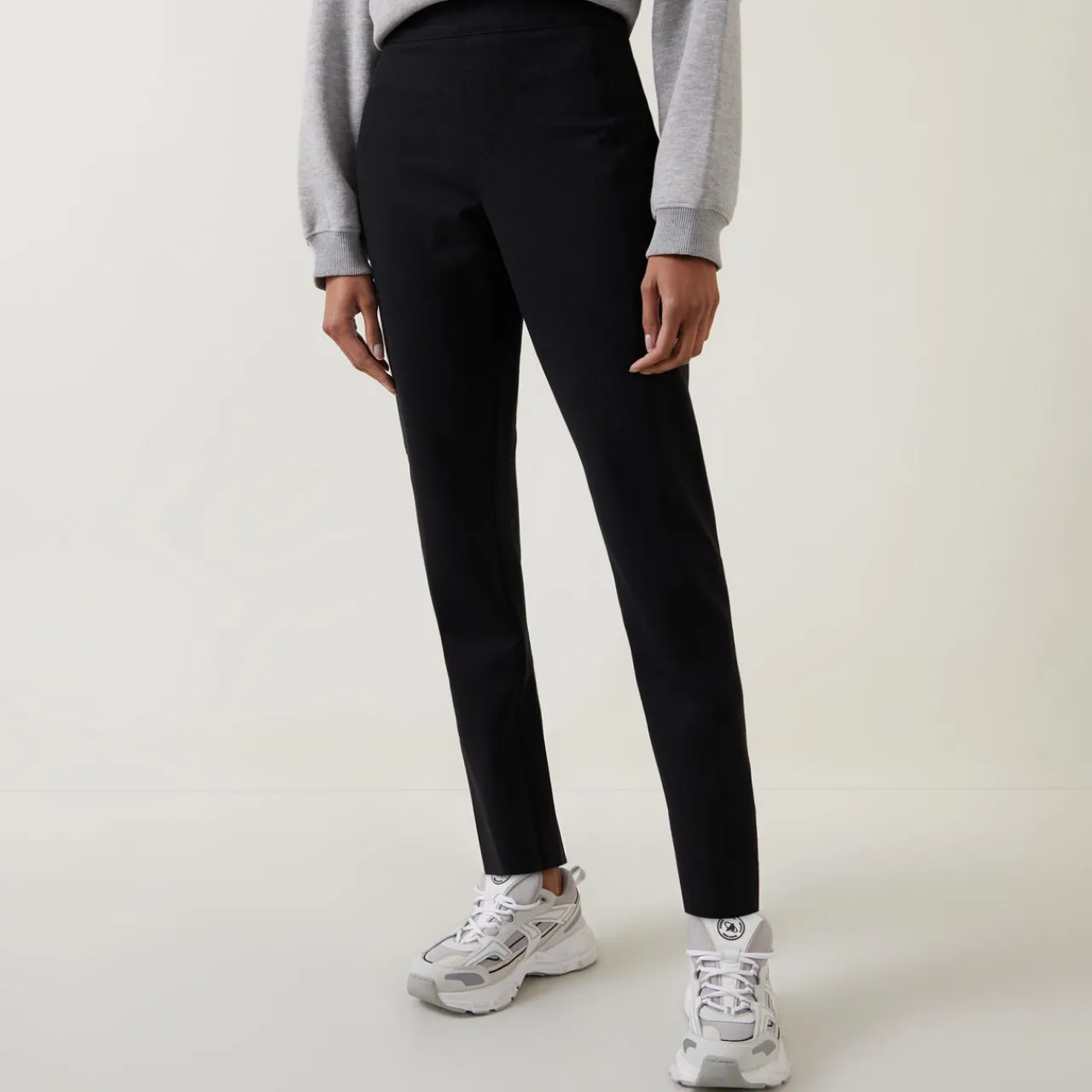 - Four way stretch, shaping fabric, high waist, straight leg, back welt pockets.