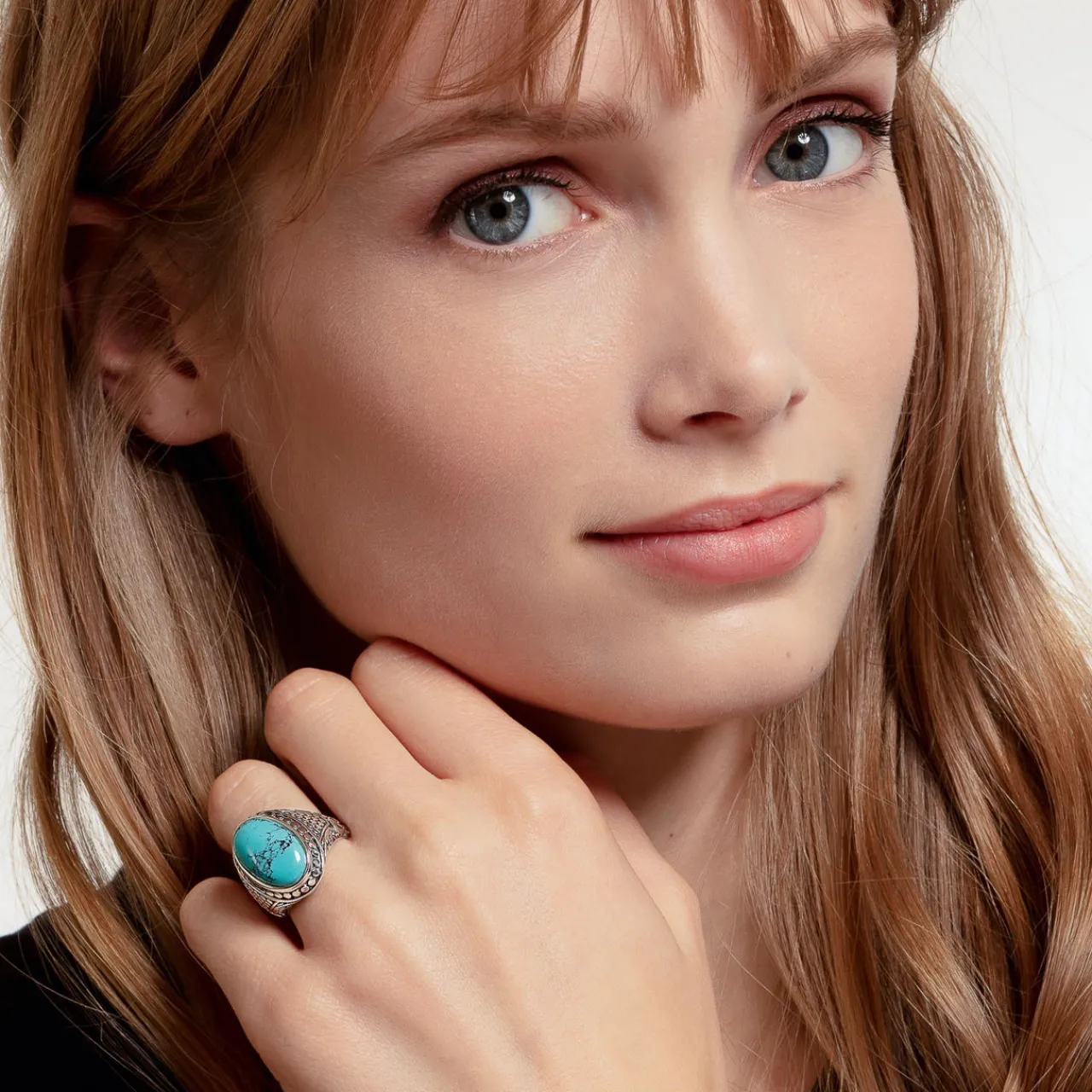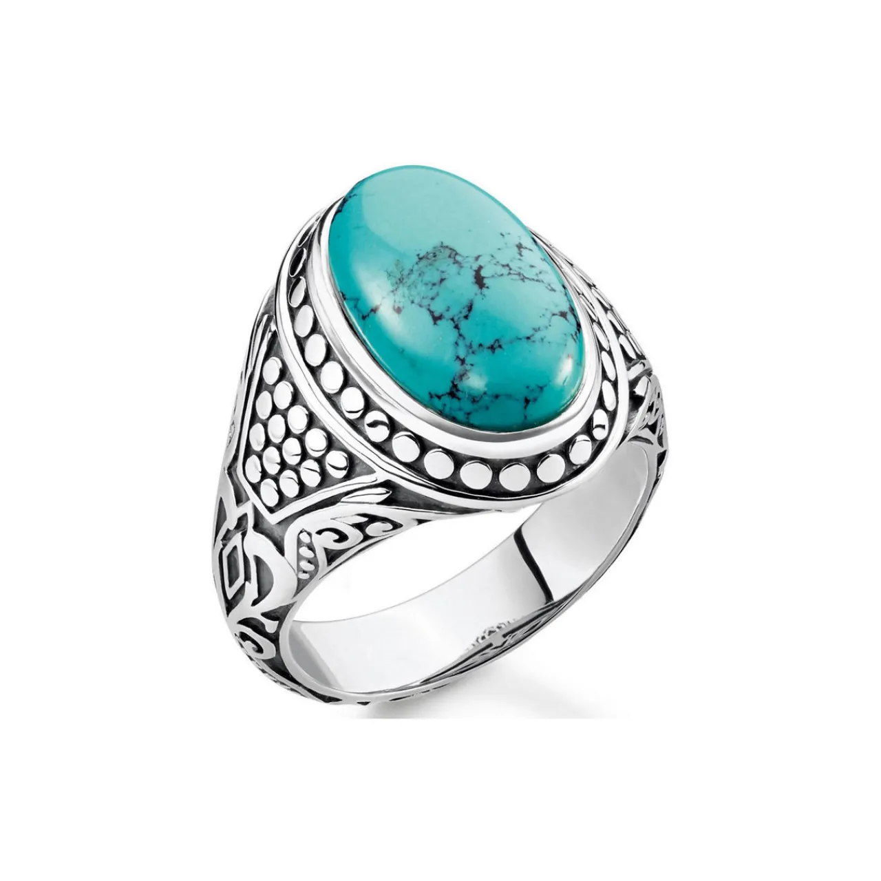 - Energetic companion: This signet ring becomes a powerful statement thanks to the imitation turquoise as a centre stone. Its bright colour is believed to provide new strength and a clear mind. The vintage cut of the stone, the finest engraving lines and the unique tendril ornamentation of the iconic THOMAS SABO design language refine this extraordinary piece of jewellery down to the last detail.