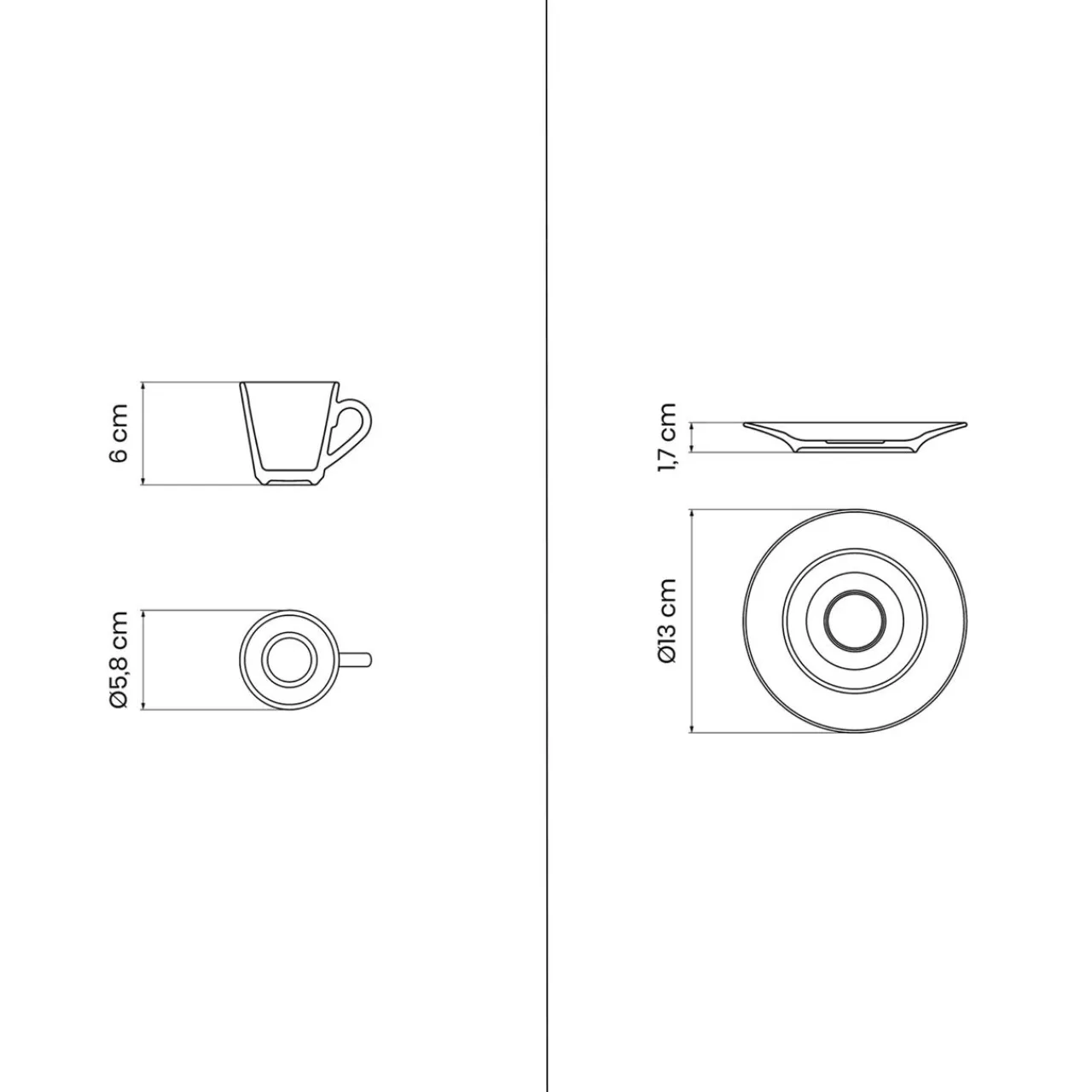 - Dimensions: Cup: 6 x 5.8 x 5.8cm. Capacity: 70ml. Saucer: 13 x 13 x 1.7cm. Overall product weight: 0.26kg
