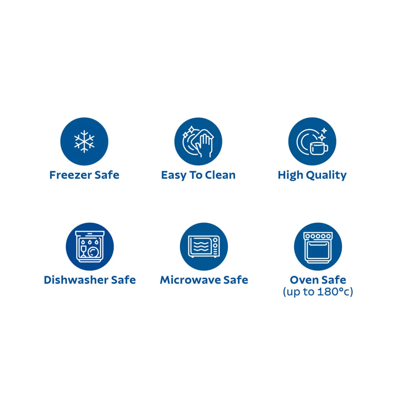 - Freezer, microwave and oven safe up to 180 degrees Celsius. Sudden changes in temperature can lead to cracks