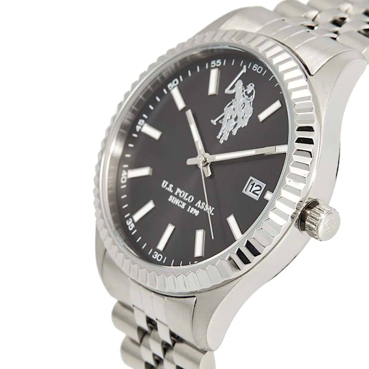 - Black dial, date window at the 3 o’clock position, silver-tone hands and markers, brand logo detailing, fluted bezel, durable silver-tone stainless steel case, stainless steel bracelet with link design, quartz movement, three hands movement type with date, round case