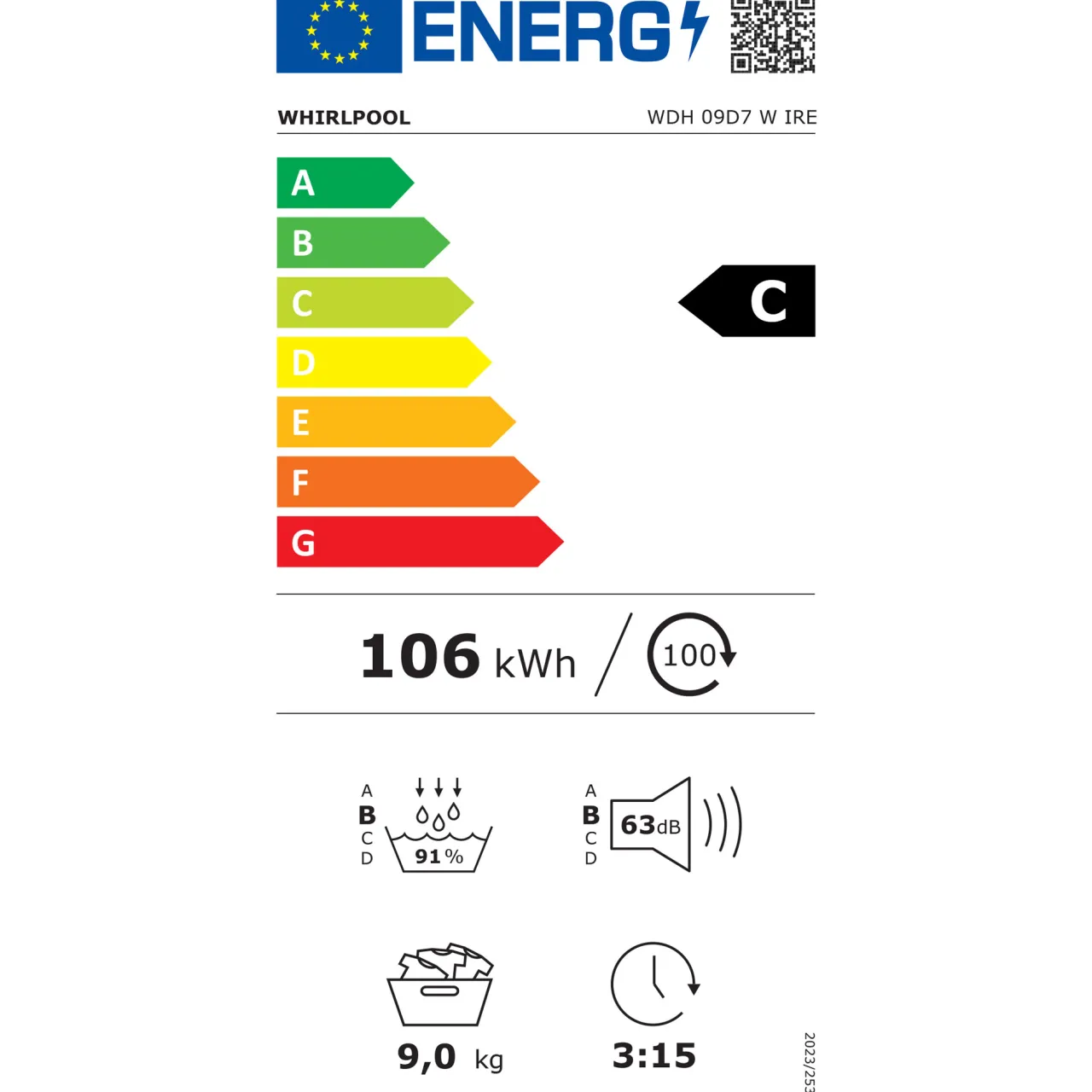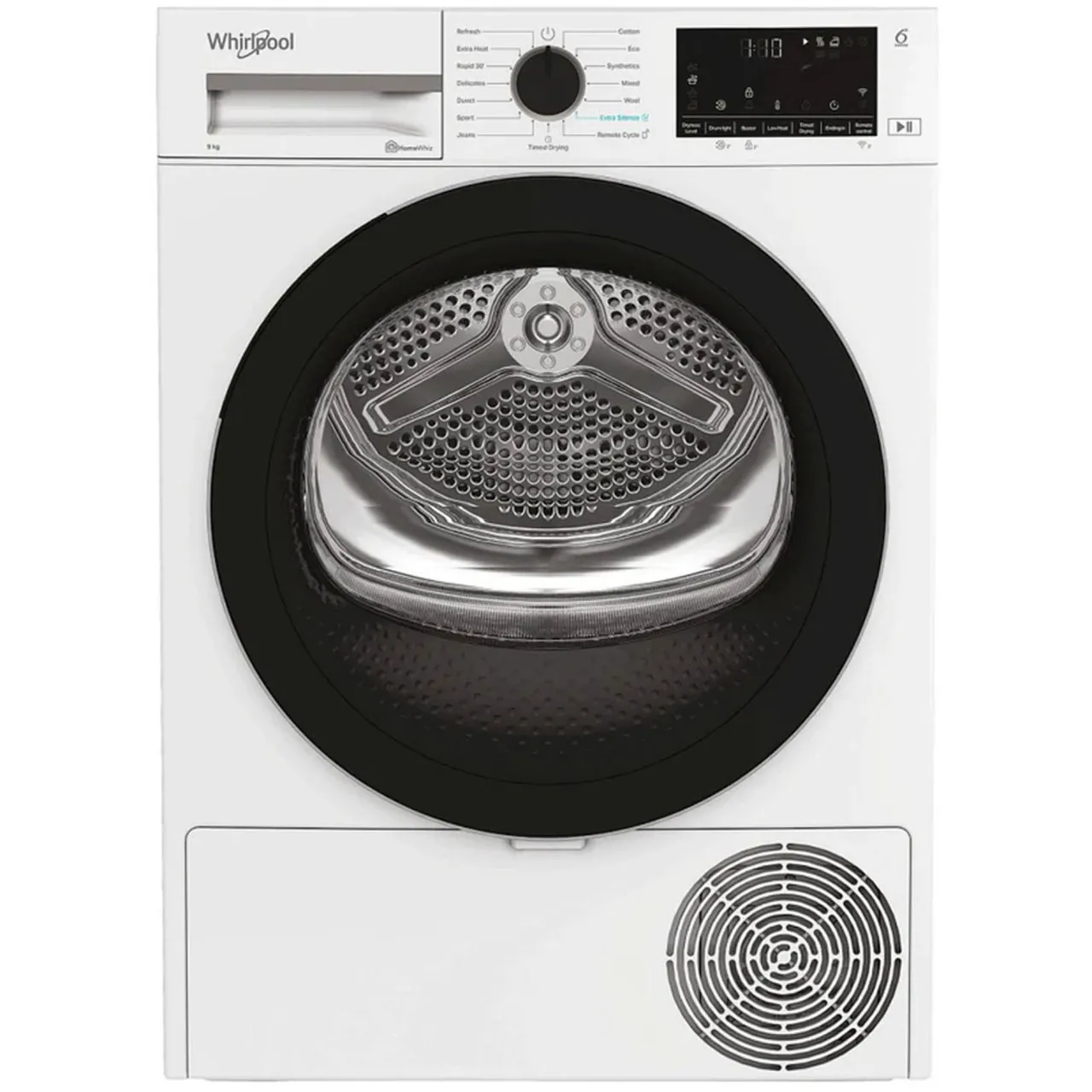 This Whirlpool freestanding Tumble Dryer features: outstanding 9,0kg drum capacity, so you will never run out of space. Exclusive 6th SENSE technology that constantly monitors the moisture in the drum, protecting your clothes and providing ideal drying results. Connectivity that allows the appliance to receive information regarding the wash cycle used by your washing machine, and adjusts settings accordingly, for ideal results. Elegant screened door design. Heat pump technology that effectively re-heats the air in the appliance, significantly reducing energy consumption.