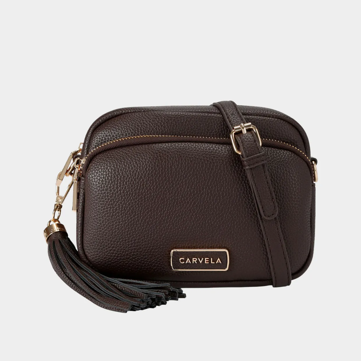 - Pebble grain texture, gold-tone hardware, branding details, statement tassel detail, zipped back pocket on the back, fits phones up to 6-inches
