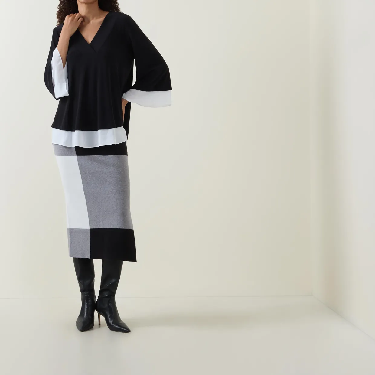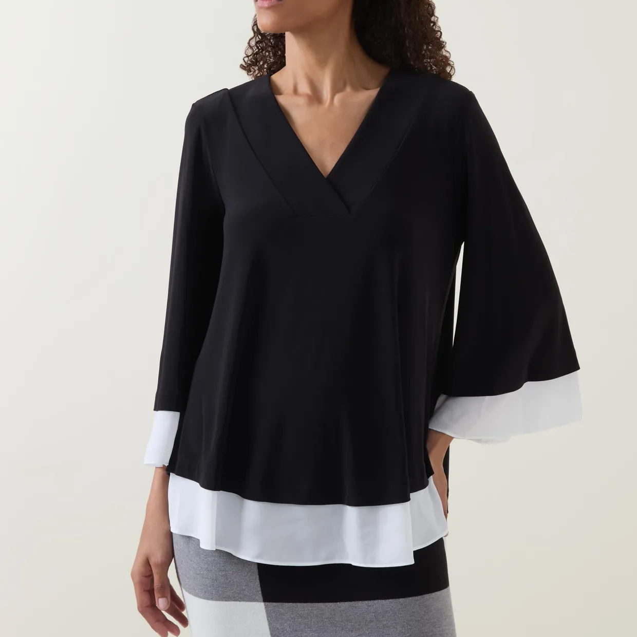 - Long sleeves, V-neckline, contrast trims, tonal stitching, smooth jersey fabric
