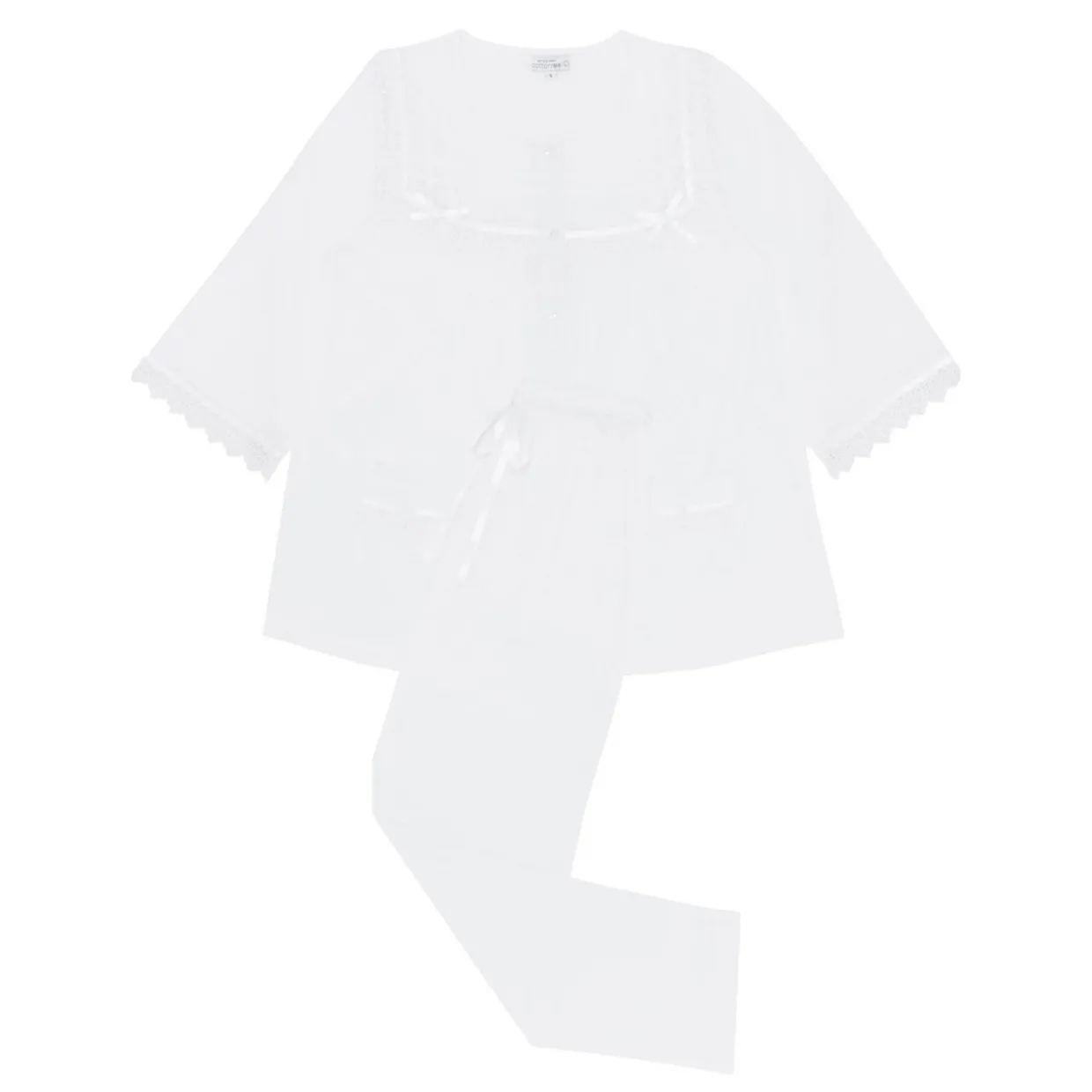 - Two-piece, button fastening, , long sleeves, drawstring waistband, embroidered floral details, sheer, bow details