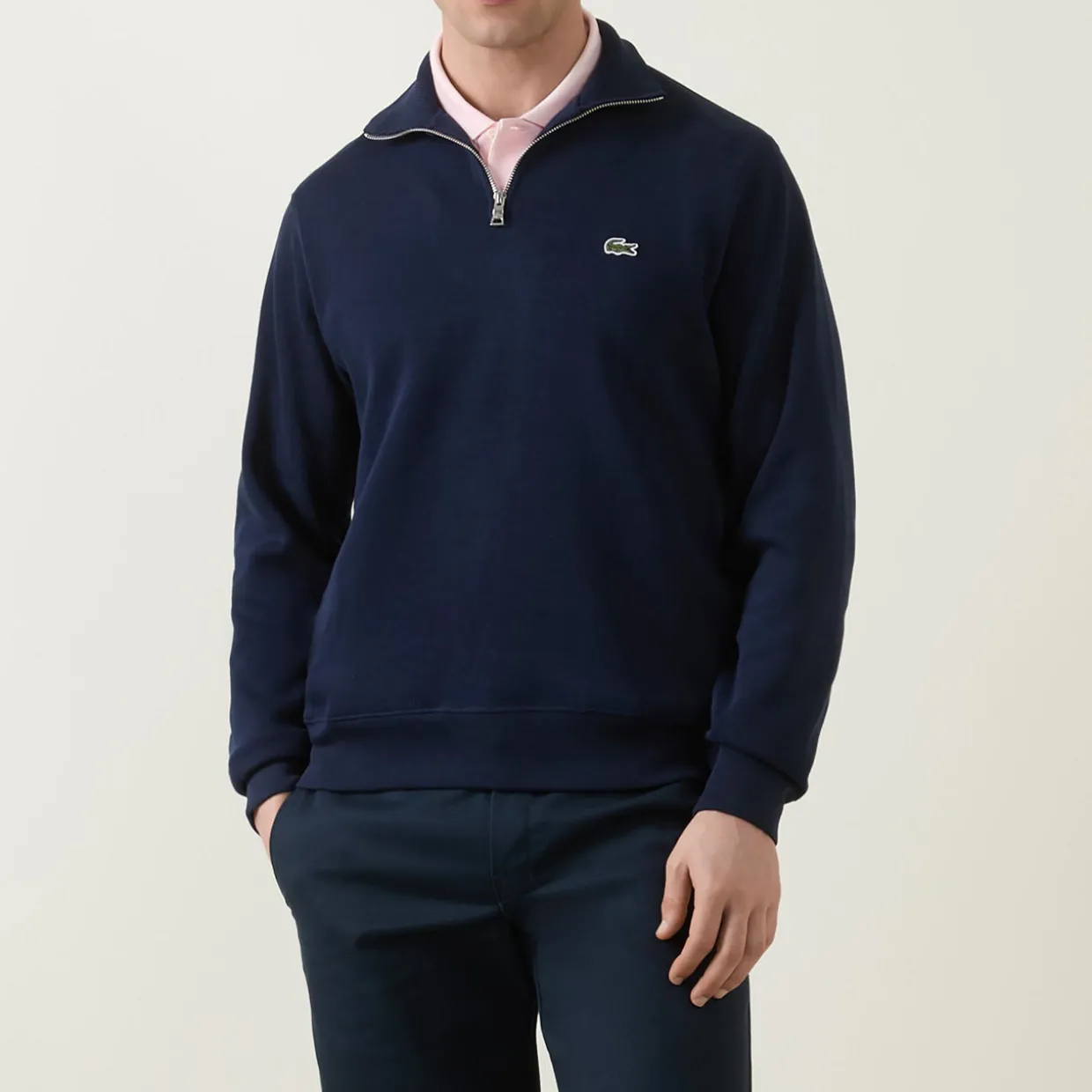 - Crocodile logo, half-zip fastening, funnel neckline, long sleeves, straight hemline, ribbed trims