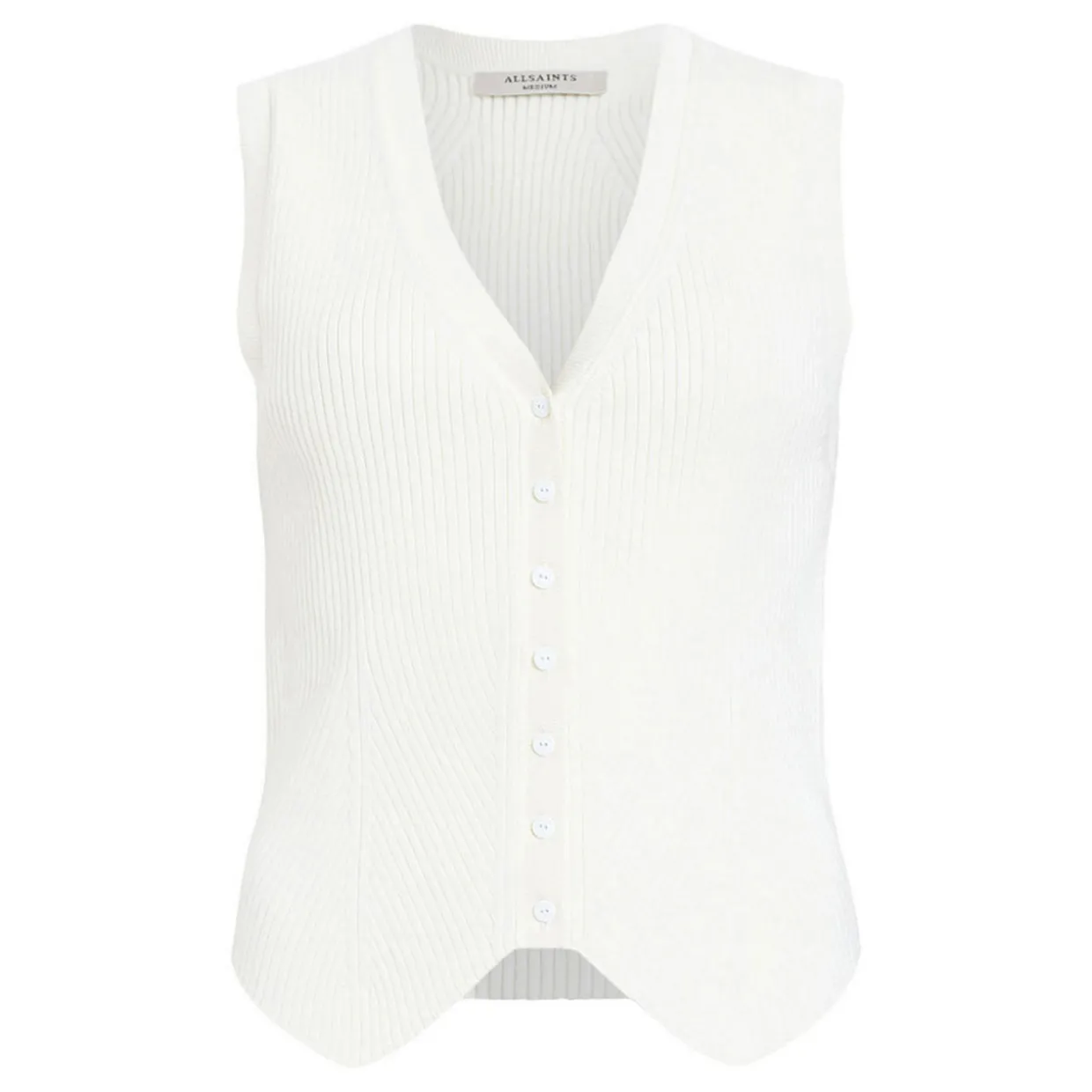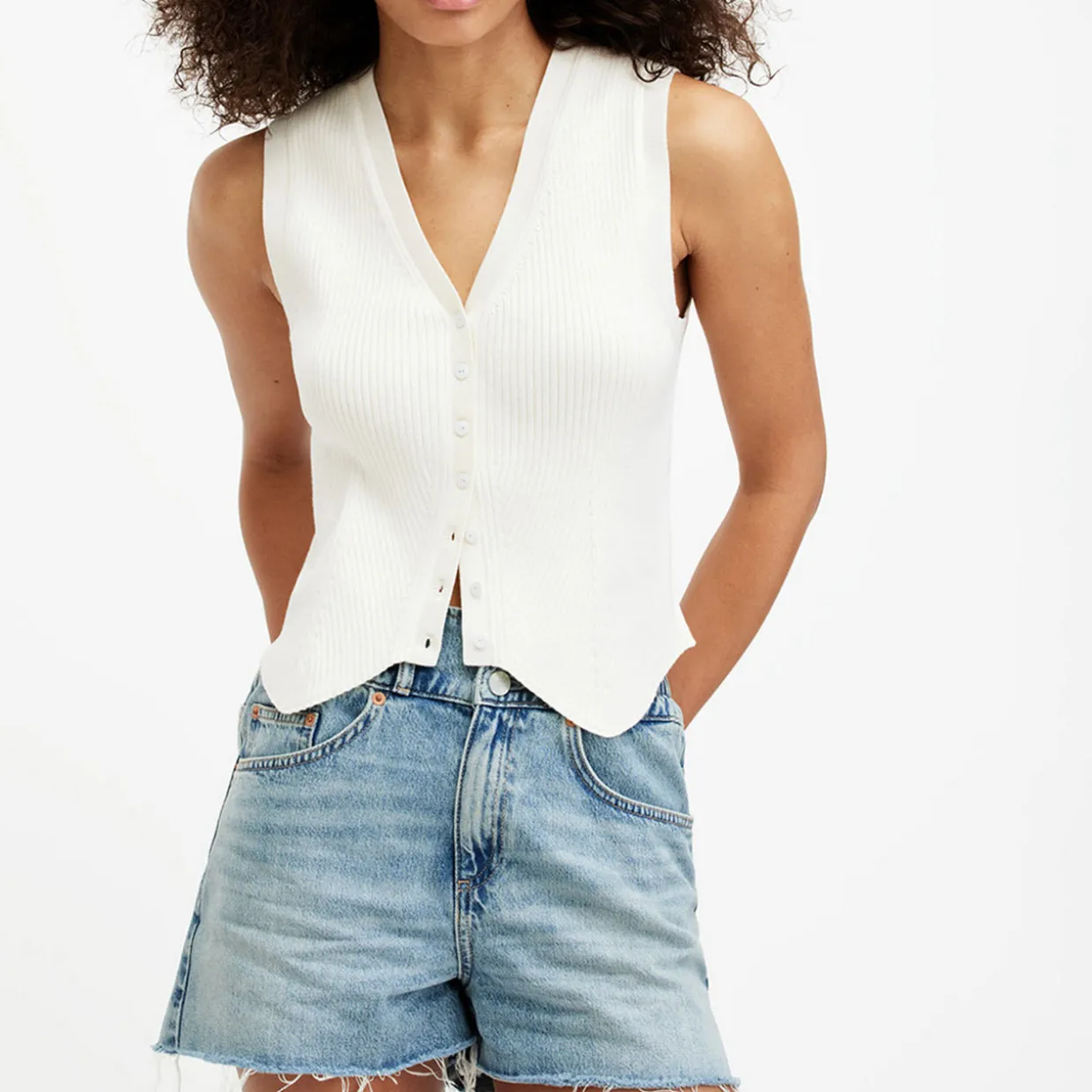 - V-neckline, sleeveless design, front button fastening, branded metal buttons, ribbed-stitch construction, lightweight