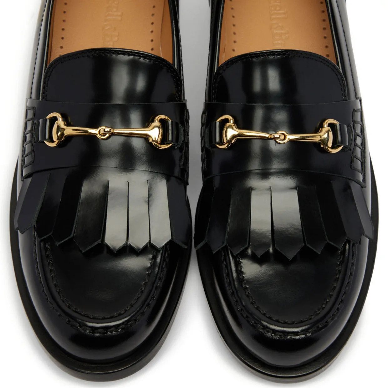 - Classic fringed detailing with a bold gold snaffle trim, high shine patent leather
