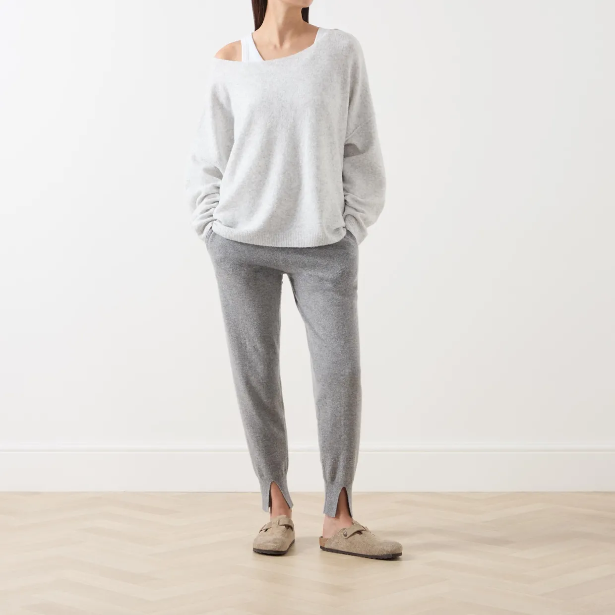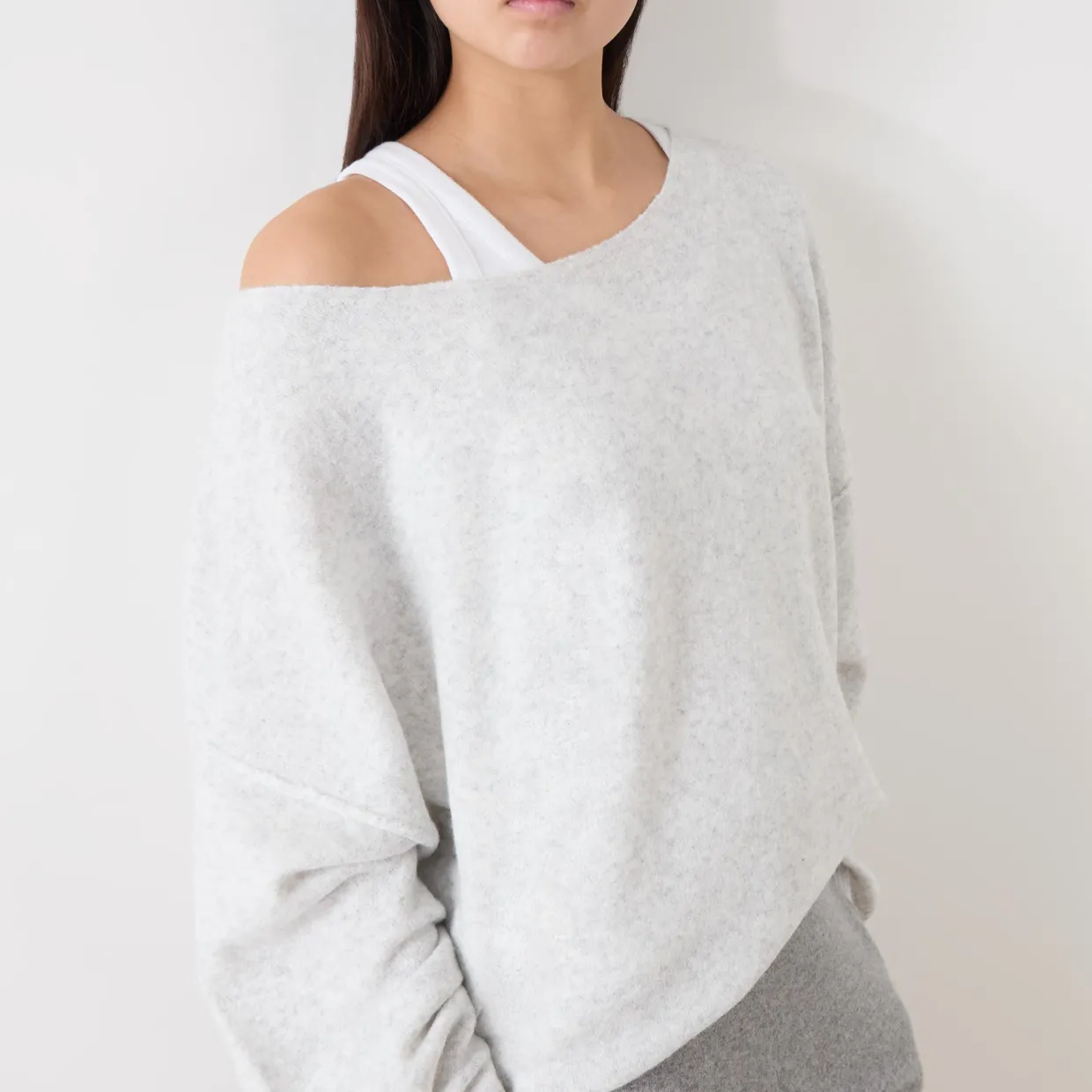 - Boat neckline, long sleeves, dropped shoulders, ribbed trims