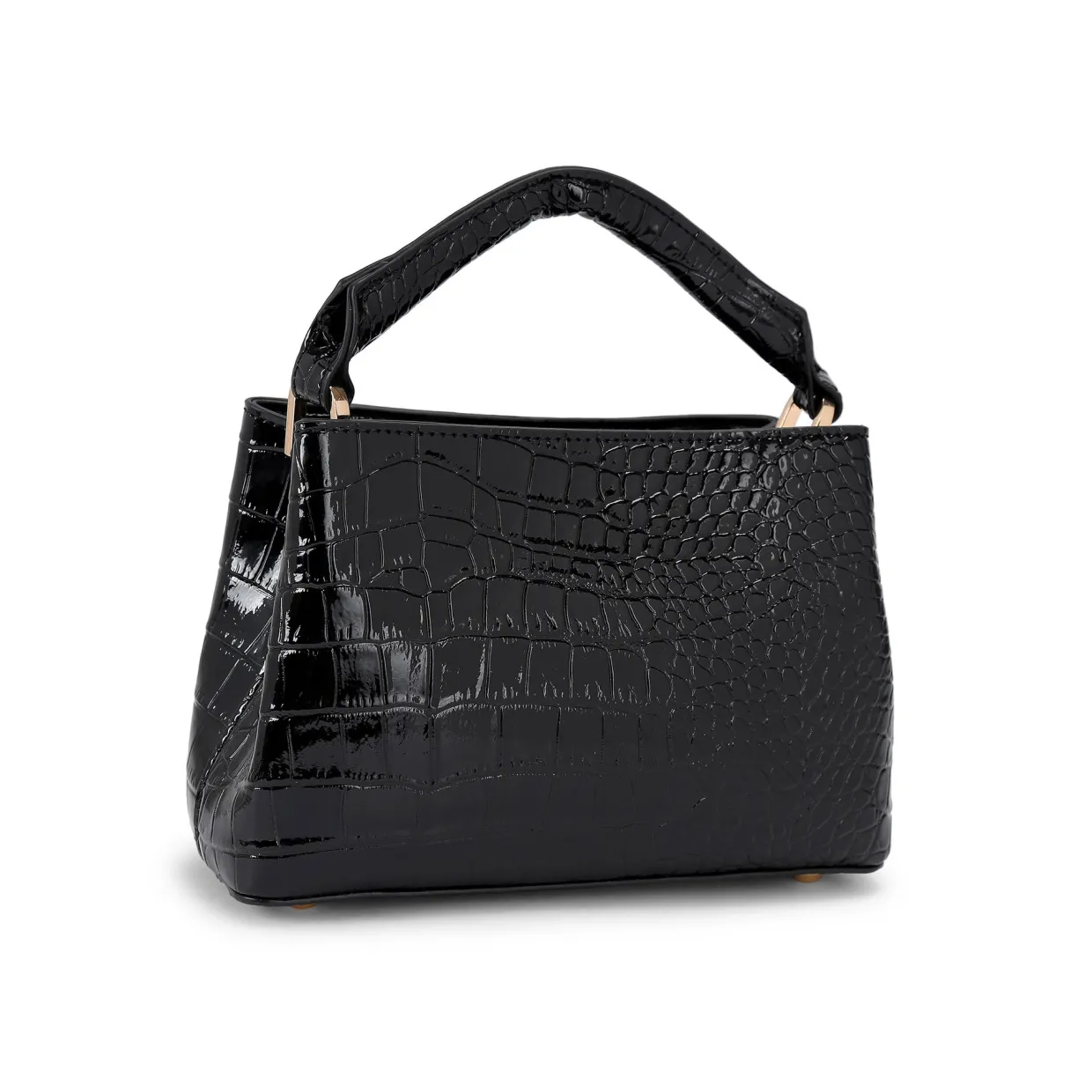 - Mini tote silhouette, patent croc-embossed leather alternative, top handle, gold branding