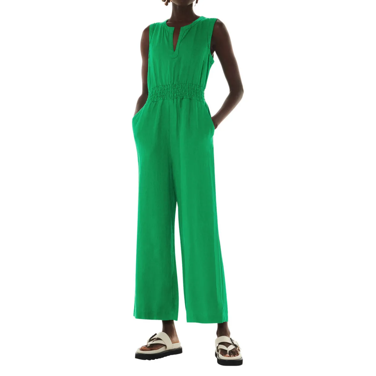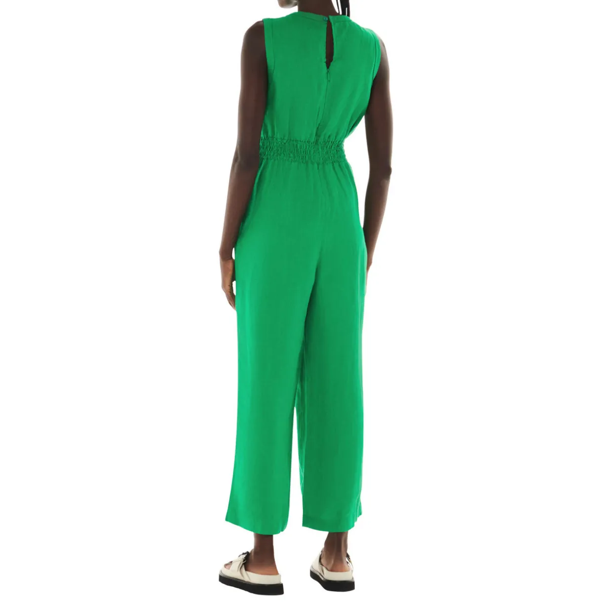 - Shirred detail at the waist, sleeveless, two side pockets, wide leg, Mandarin collar with open V-neckline, keyhole detail at the back