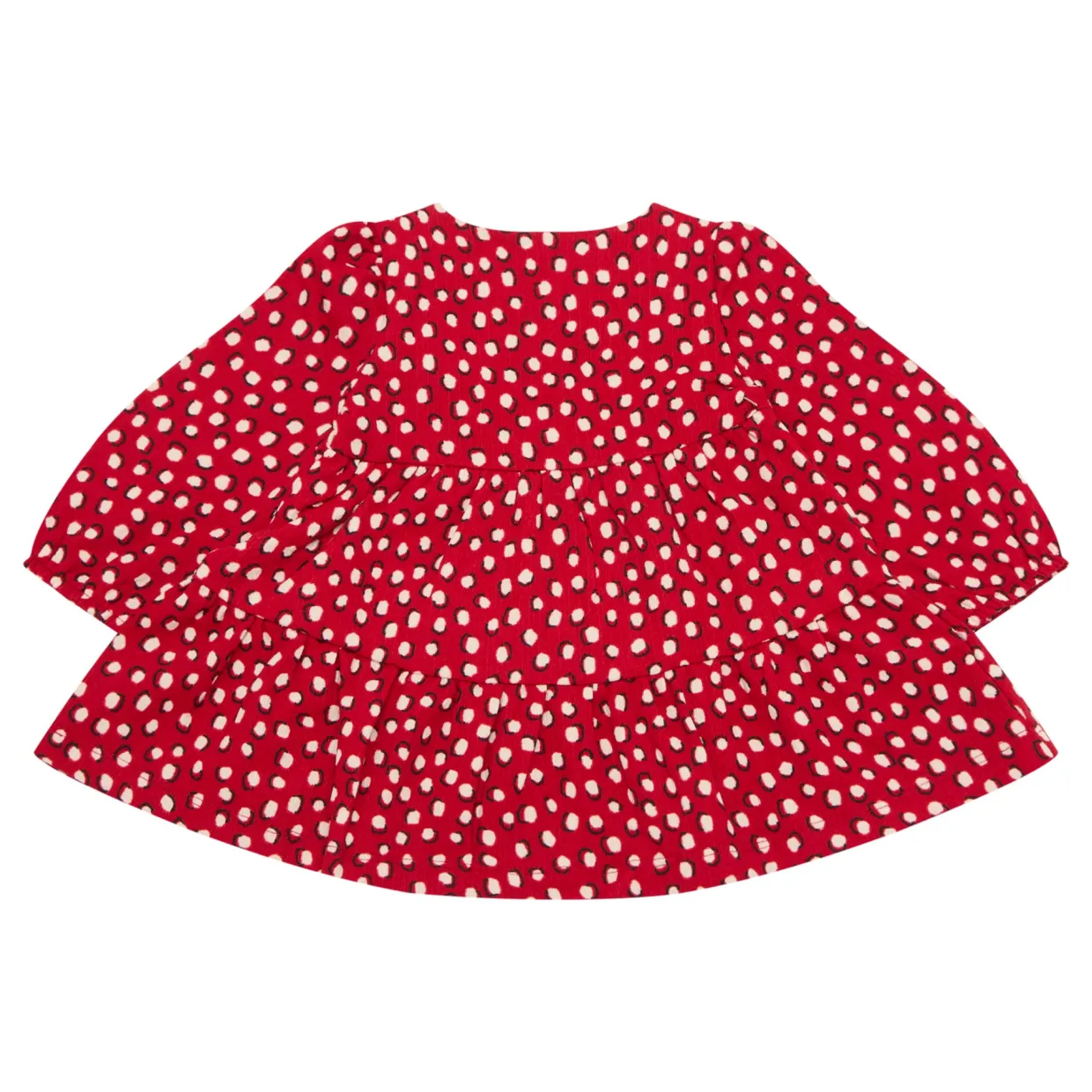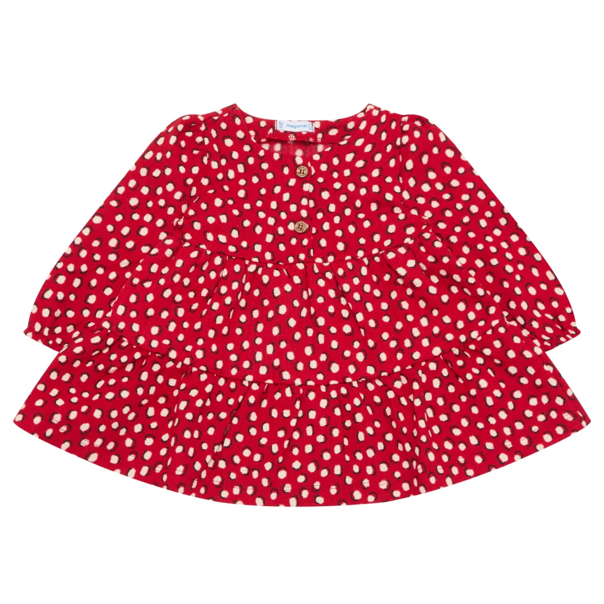 - Dotted print, round neck, button fastenings, tiered skirt