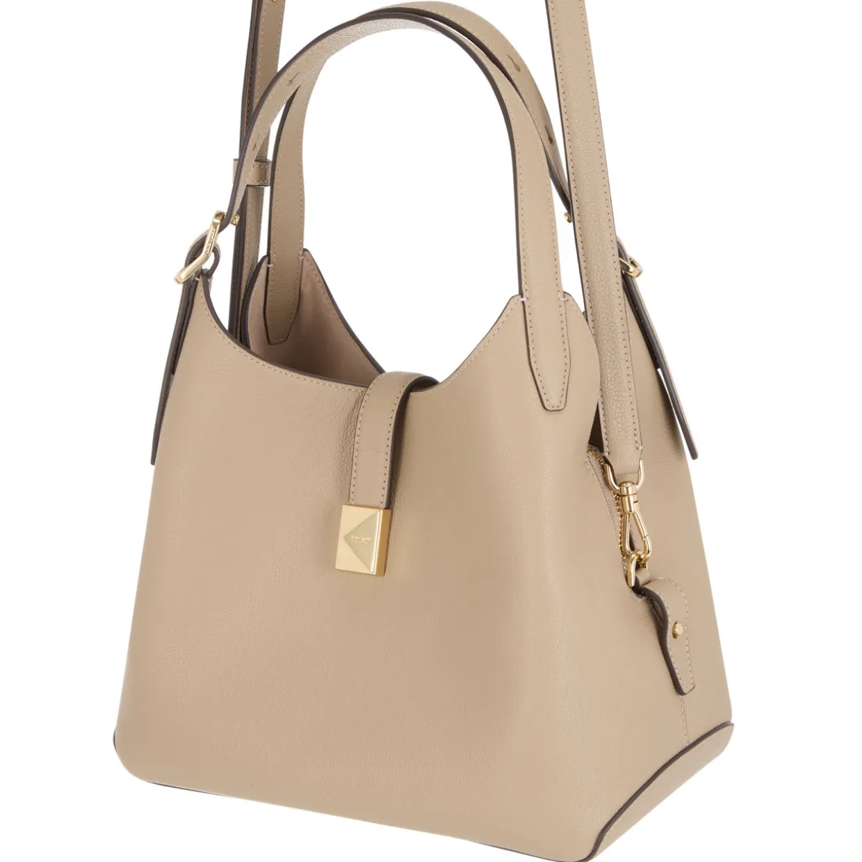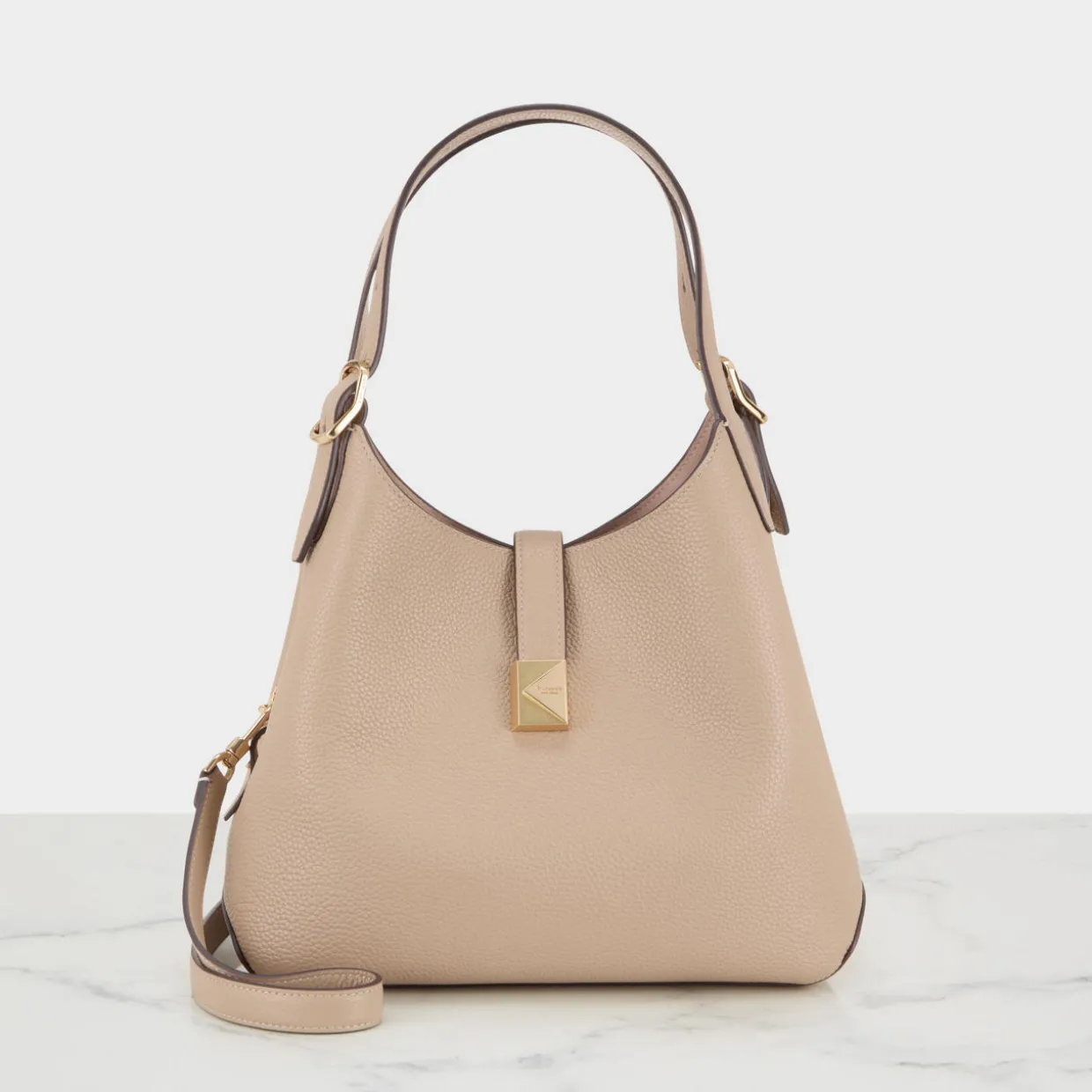 - Magnetic snap closure, adjustable shoulder strap, detachable and adjustable crossbody strap, gold-tone finishes, K hardware, pebbled leather texture