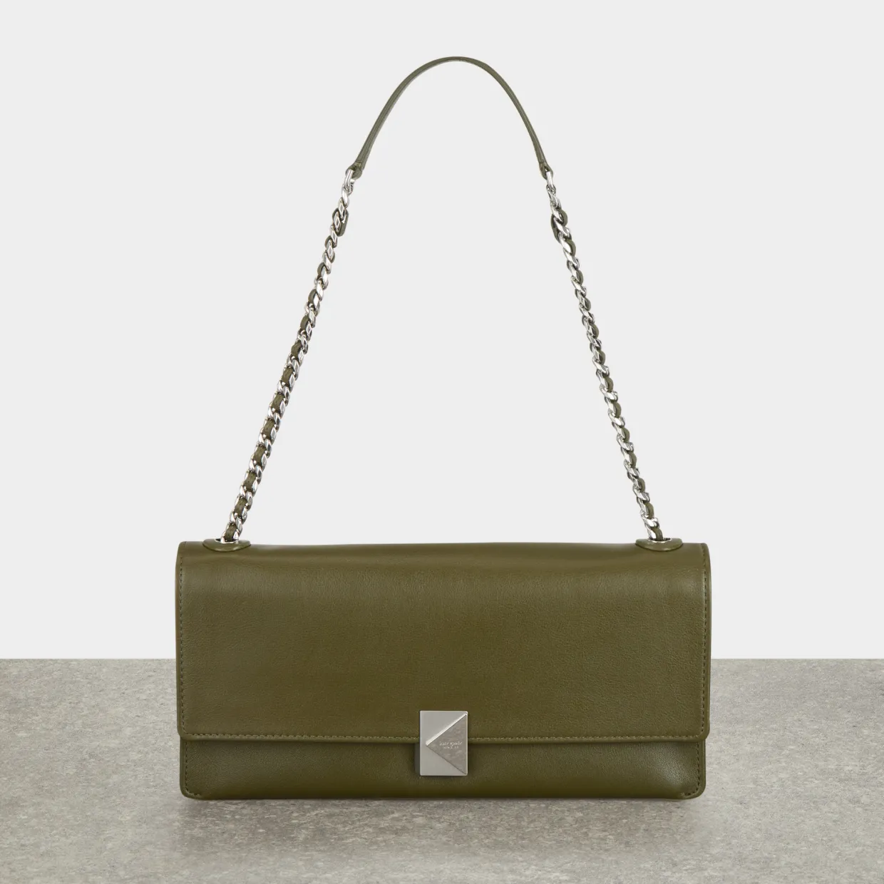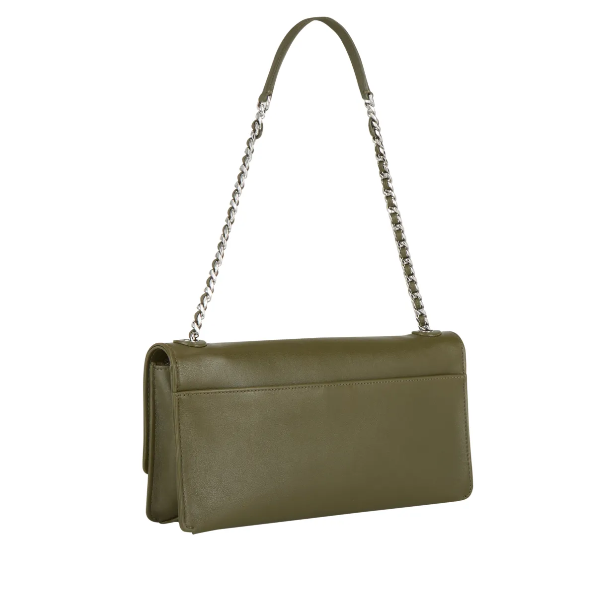 - Foldover flap closure, snap fastening, chain link crossbody strap, back slip pocket, silver-tone hardware, tonal stitching, smooth leather finish