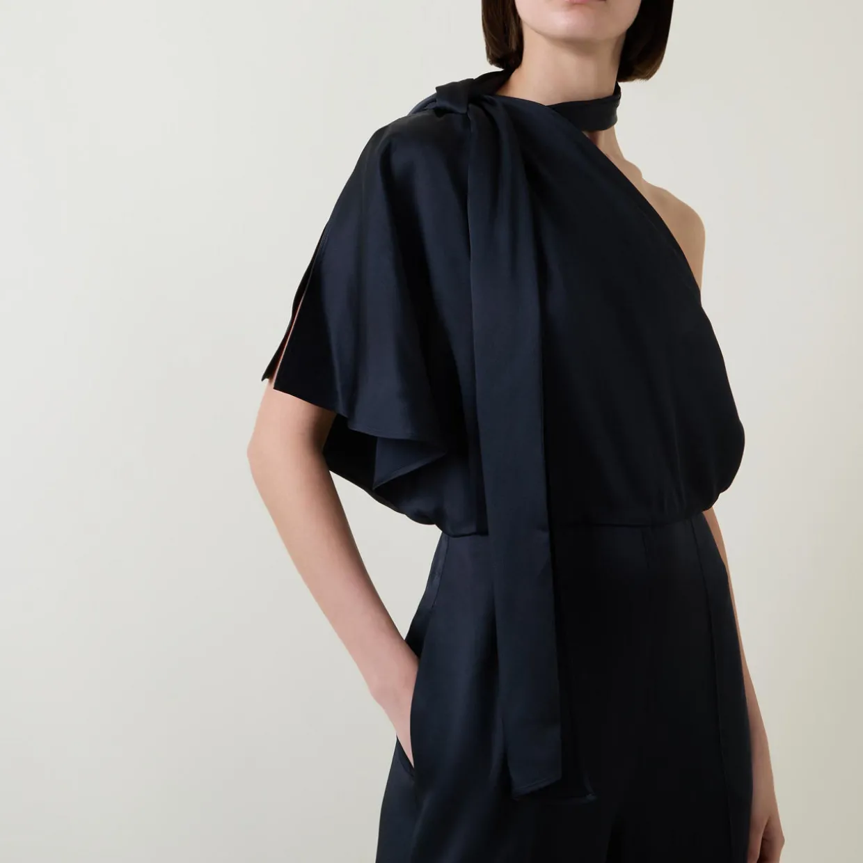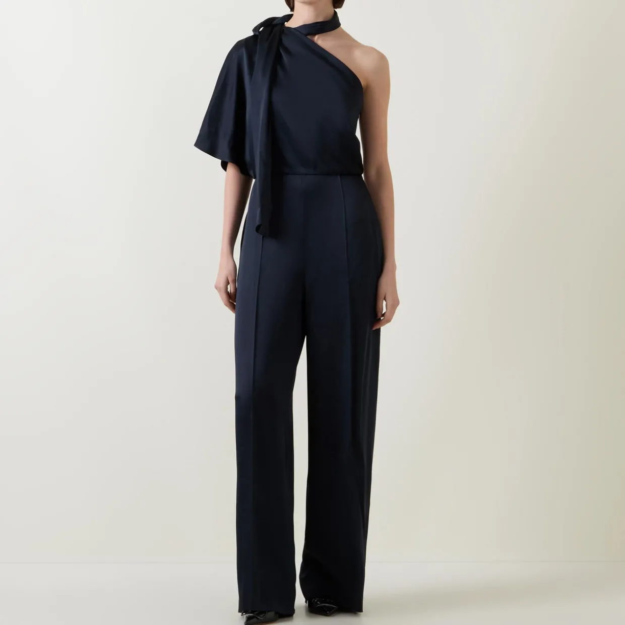 - One shoulder design, flutter sleeve, neck-tie detailing, cinched waist, side zip fastening, straight leg, full length, clean hems, pressed creases, satin finish