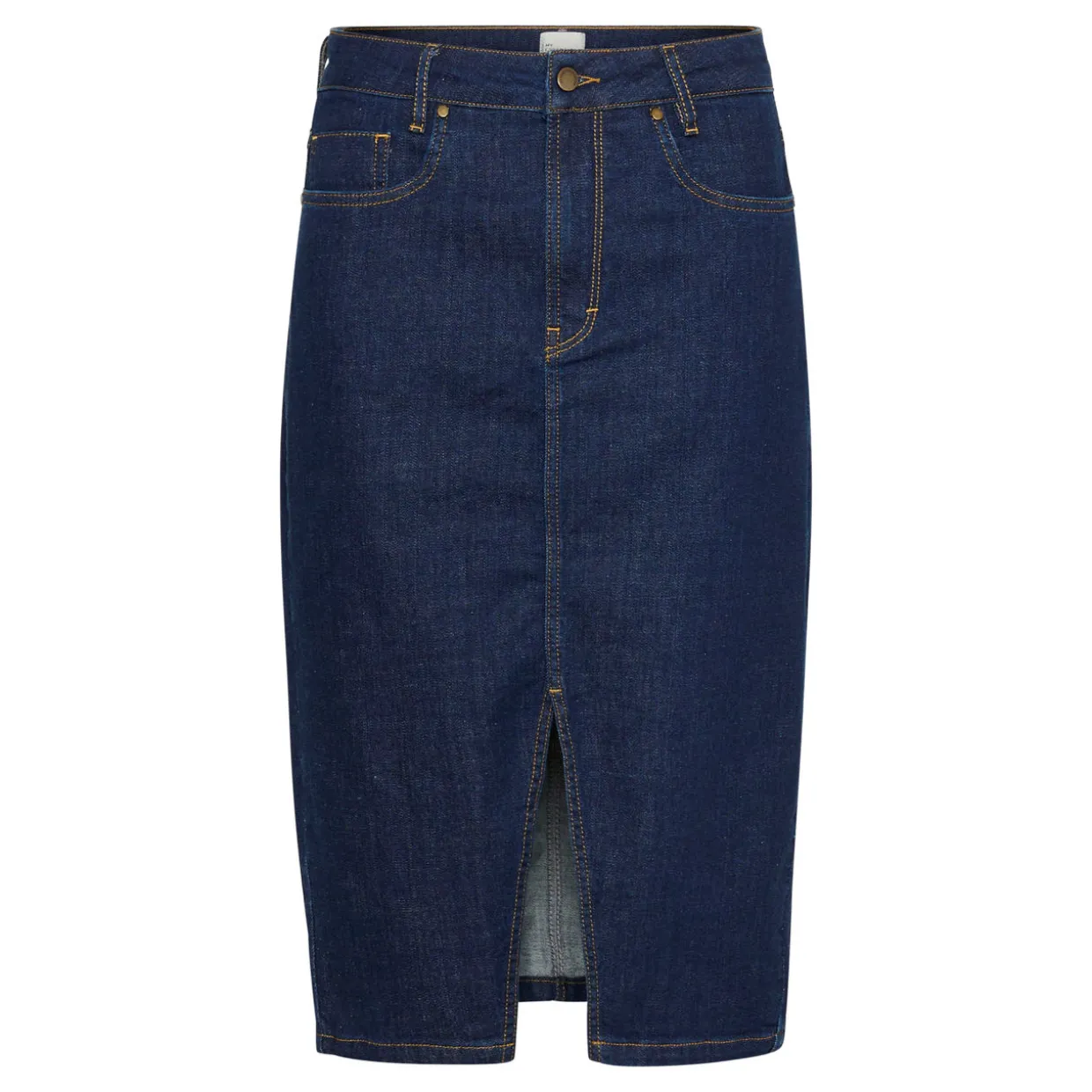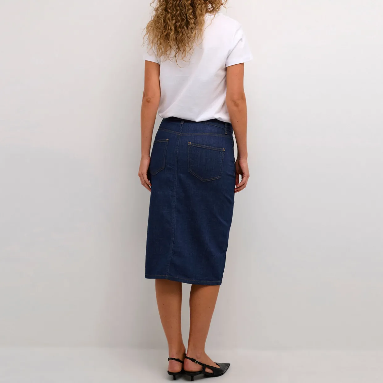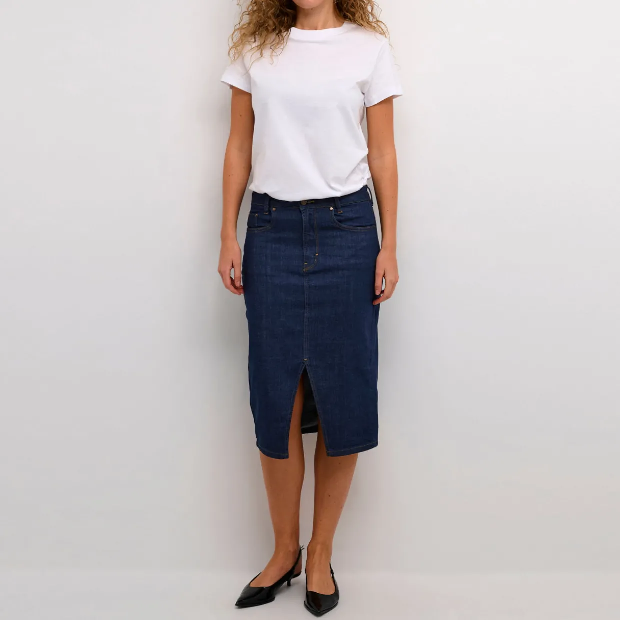 - Regular waistband, zip fly and button fastening, pencil silhouette, midi length, back yoke, five-pocket style, contrast stitching, belt loops, front slit