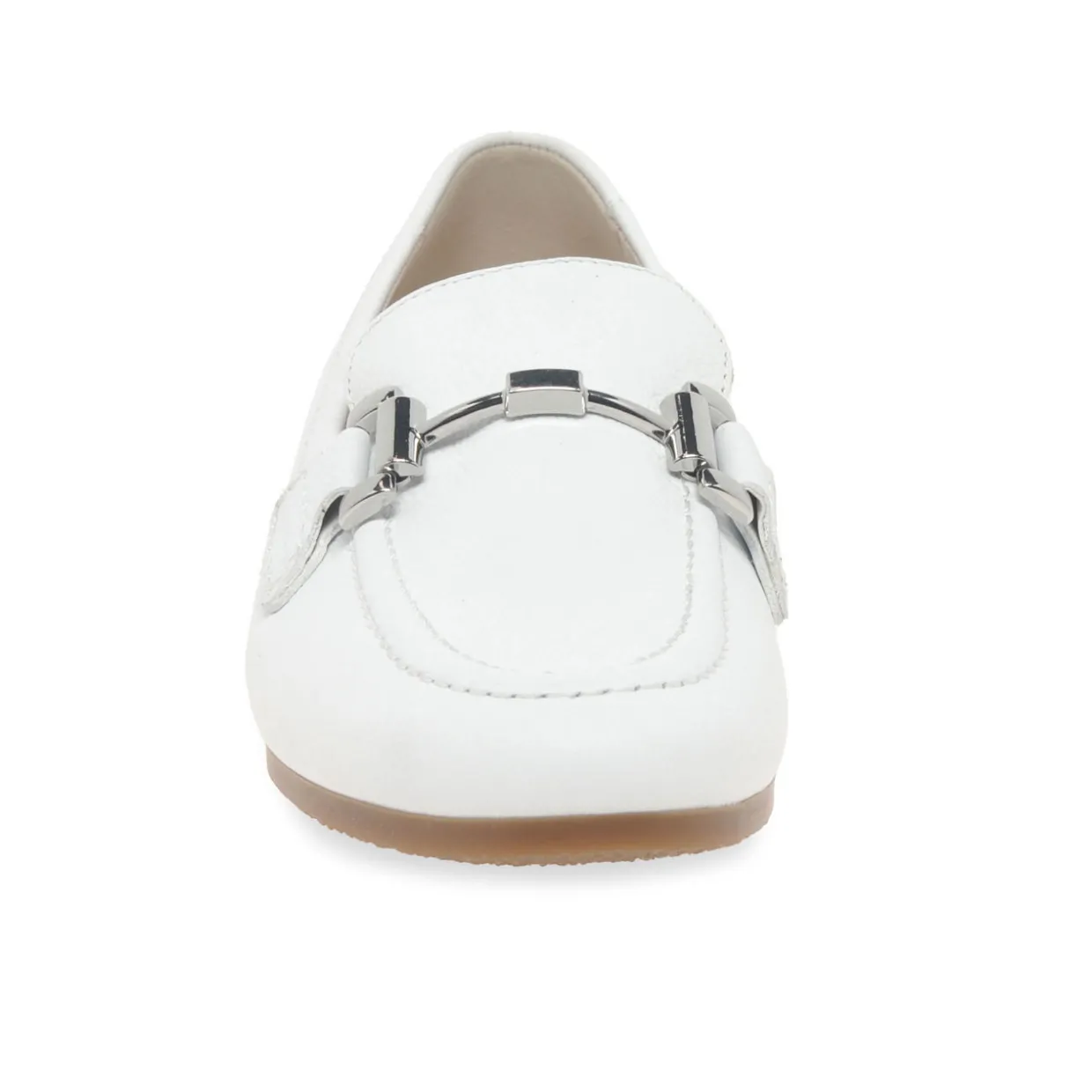 - Slip-on style, low block heel, silver-tone snaffle trim, tonal stitching, contrast sole, almond toe