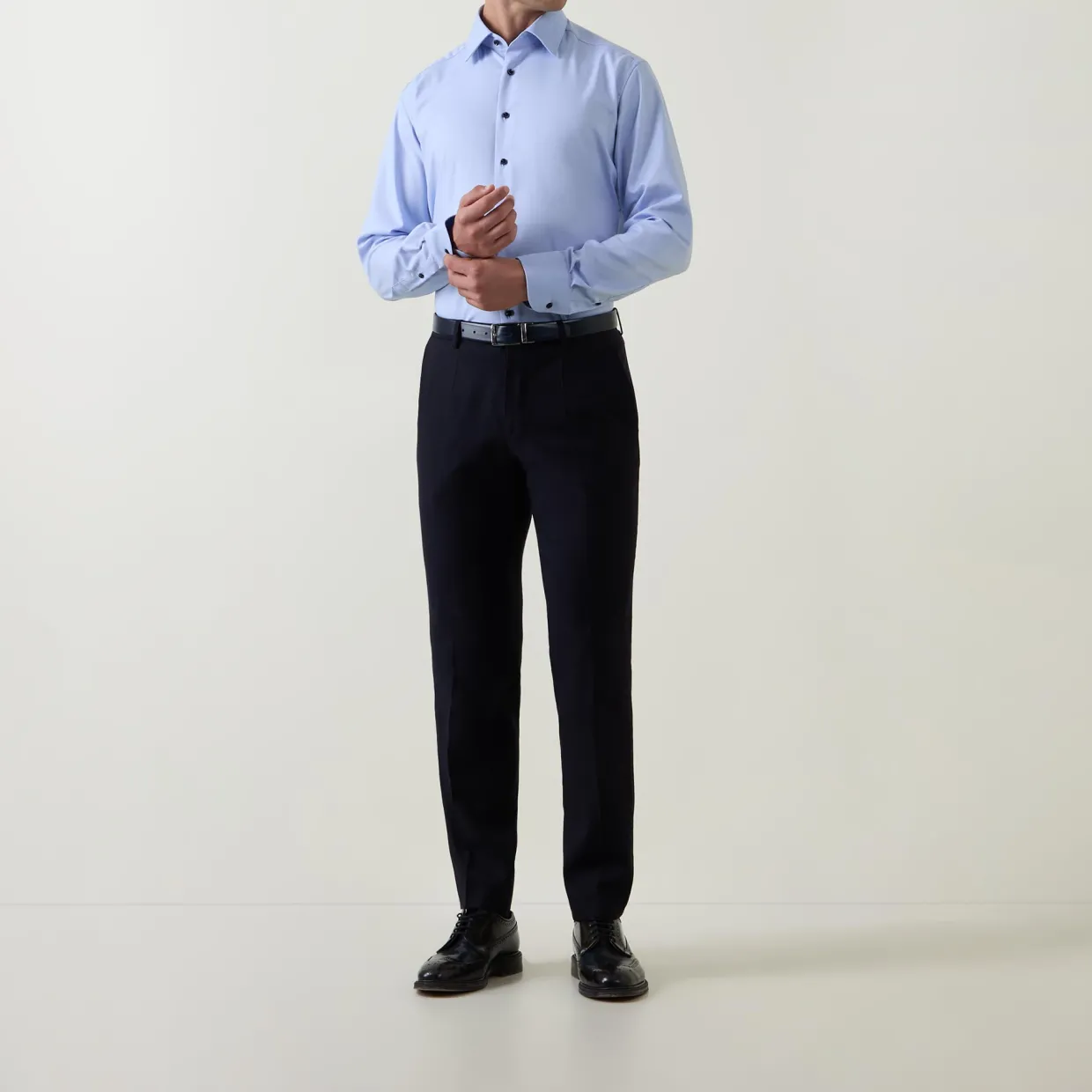 - Kent collar, button fastening, long sleeves, single-cuff, curved hemline, lightweight, non-iron and easy care