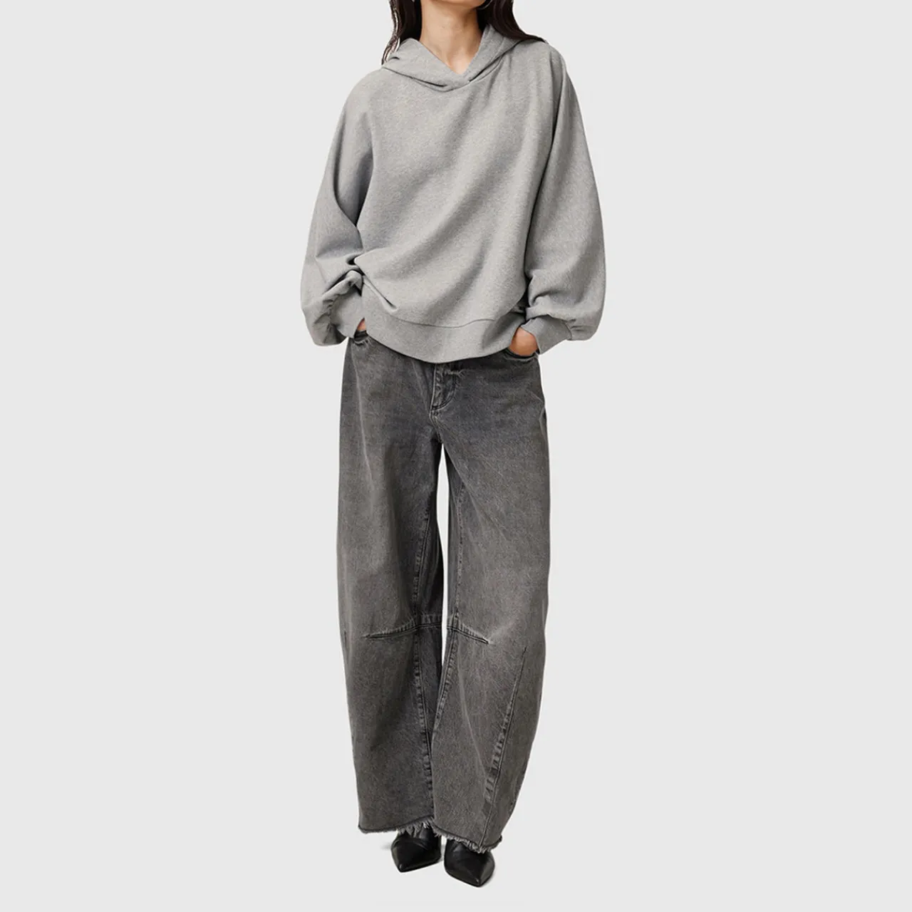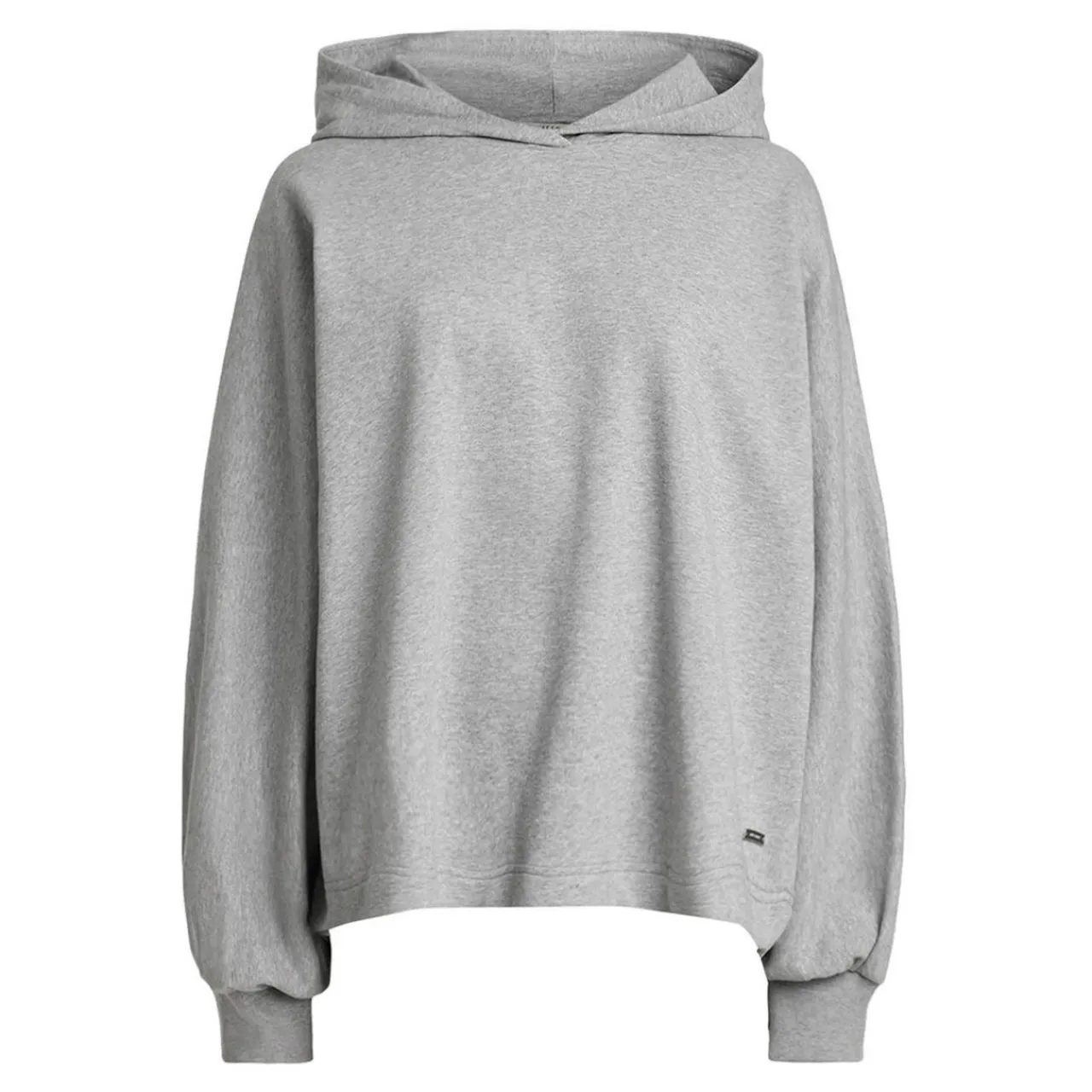 - Long batwing sleeves shape, draped silhouette, hood, pull-on style
