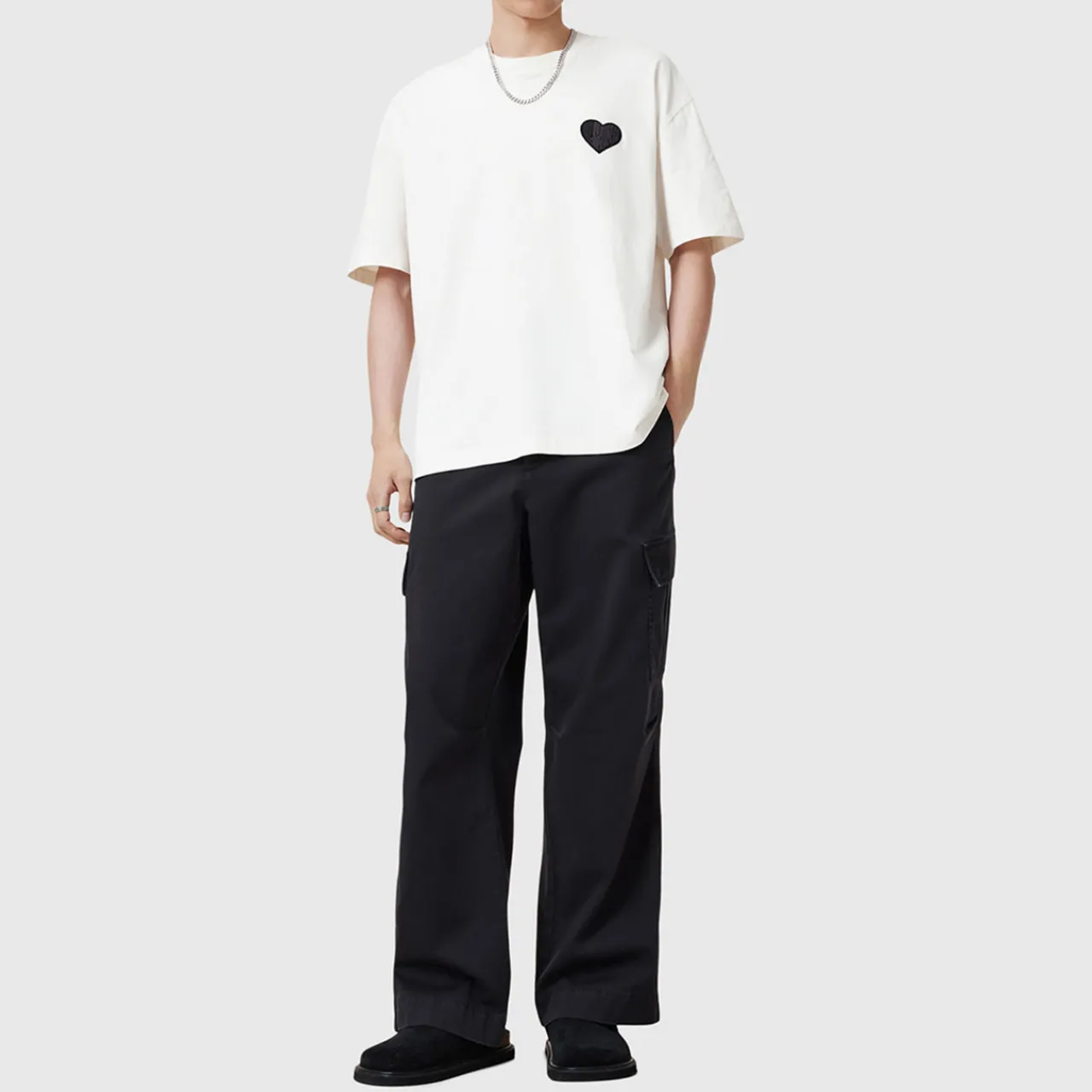 - Crew neckline, short sleeves, dropped shoulders, heart detail with logo branding, tonal stitching, pullover style, straight hemline, smooth fabric