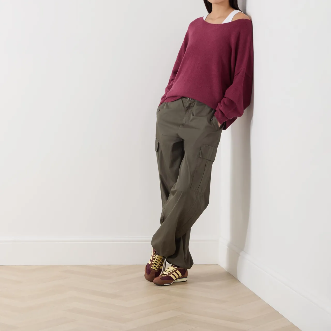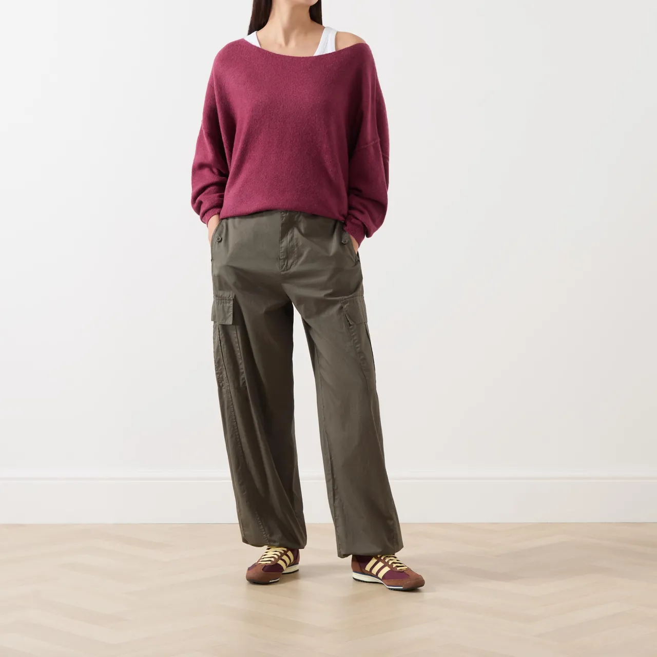 - Boat neckline, long sleeves, dropped shoulders, ribbed trims