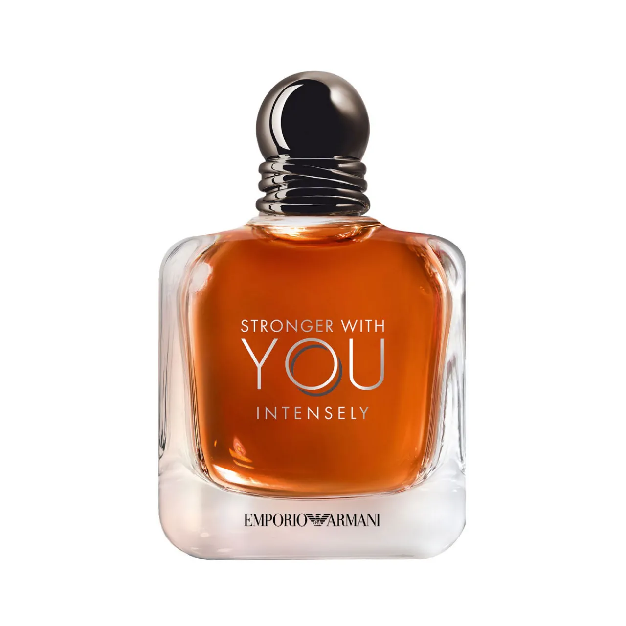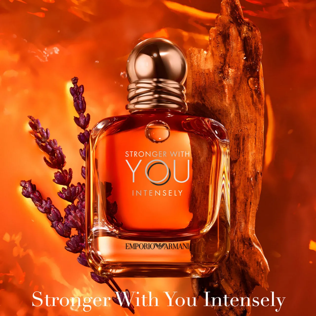 Discover Emporio Armani’s STRONGER WITH YOU INTENSELY. It reflects the personality of today’s man in search of an intense, longlasting fragrance that lights up his profound love story. This addictive fougere scent is based on a warm vanilla accord and vibrant ambery woods accord and contrasted with an audacious pink pepper top note.