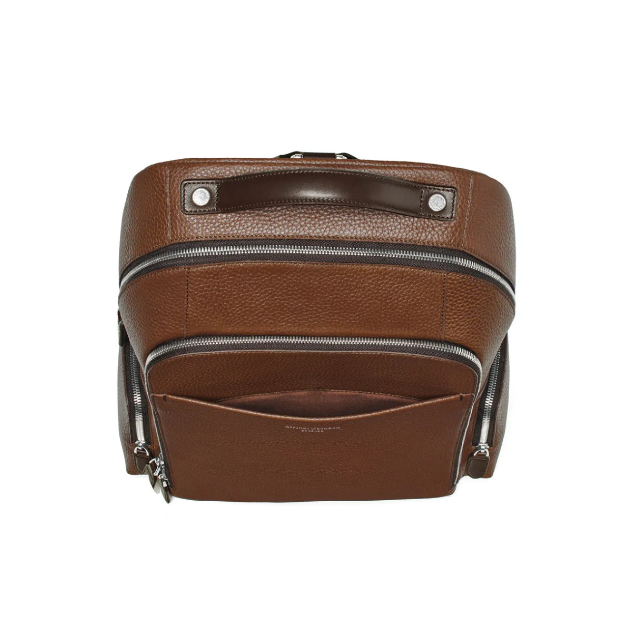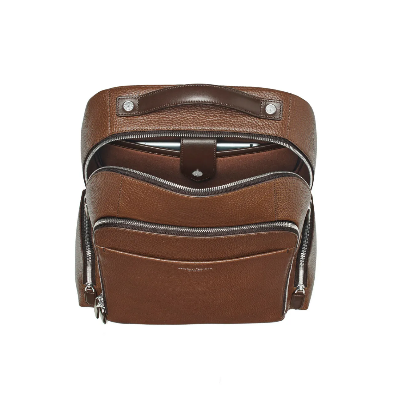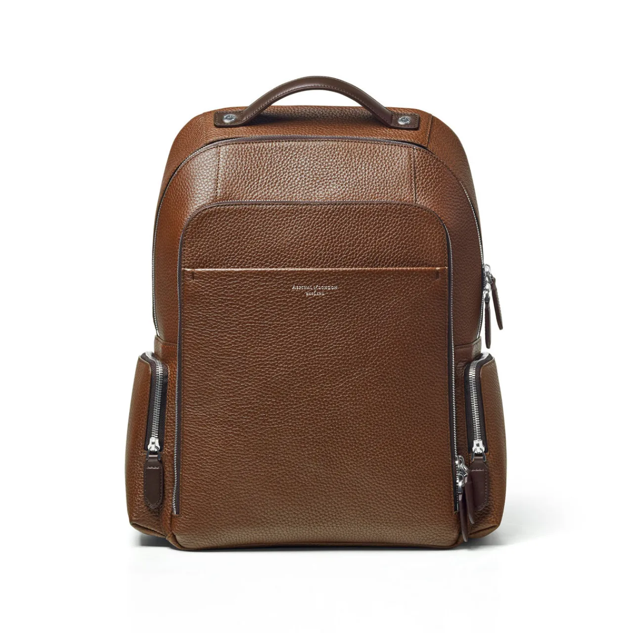 - Carry handle, dual zip fastening, two exterior side pockets with zip fastenings, one front pocket with dual zip fastening, one front slip pocket, adjustable webbing straps, signature silver-tone hardware, padded mesh back panel, logo detail, pebbled finish