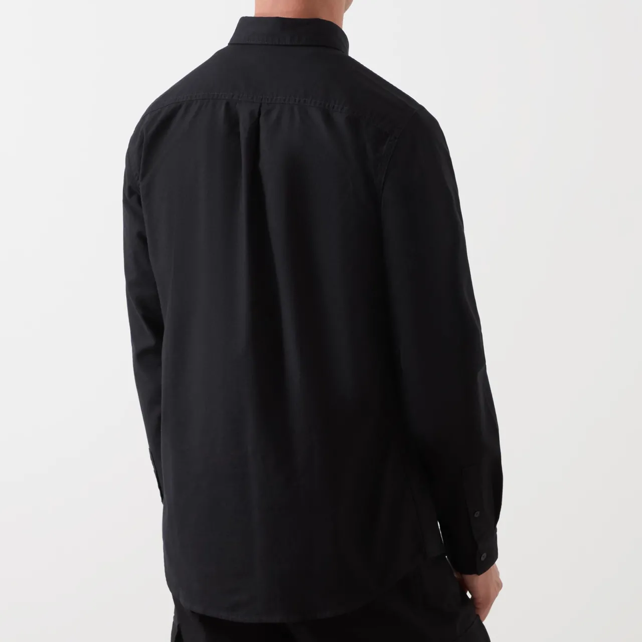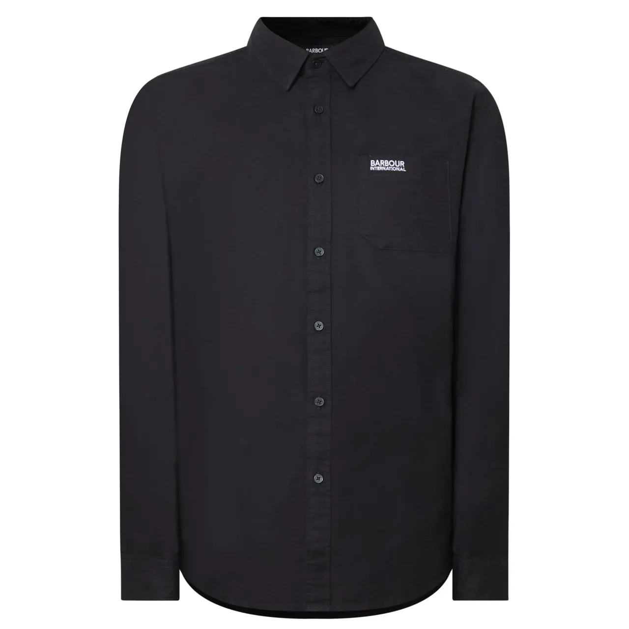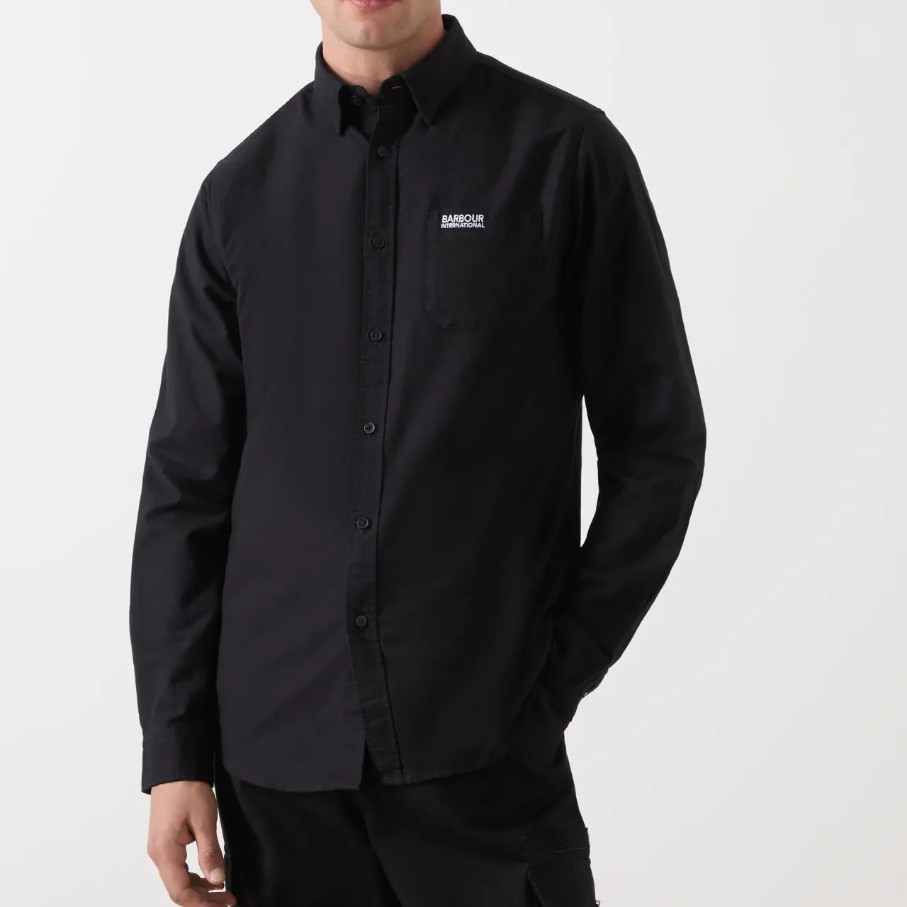 - Classic collar, button fastening, long sleeves, single cuff, curved hemline, chest patch pocket, logo details, box pleat at rear