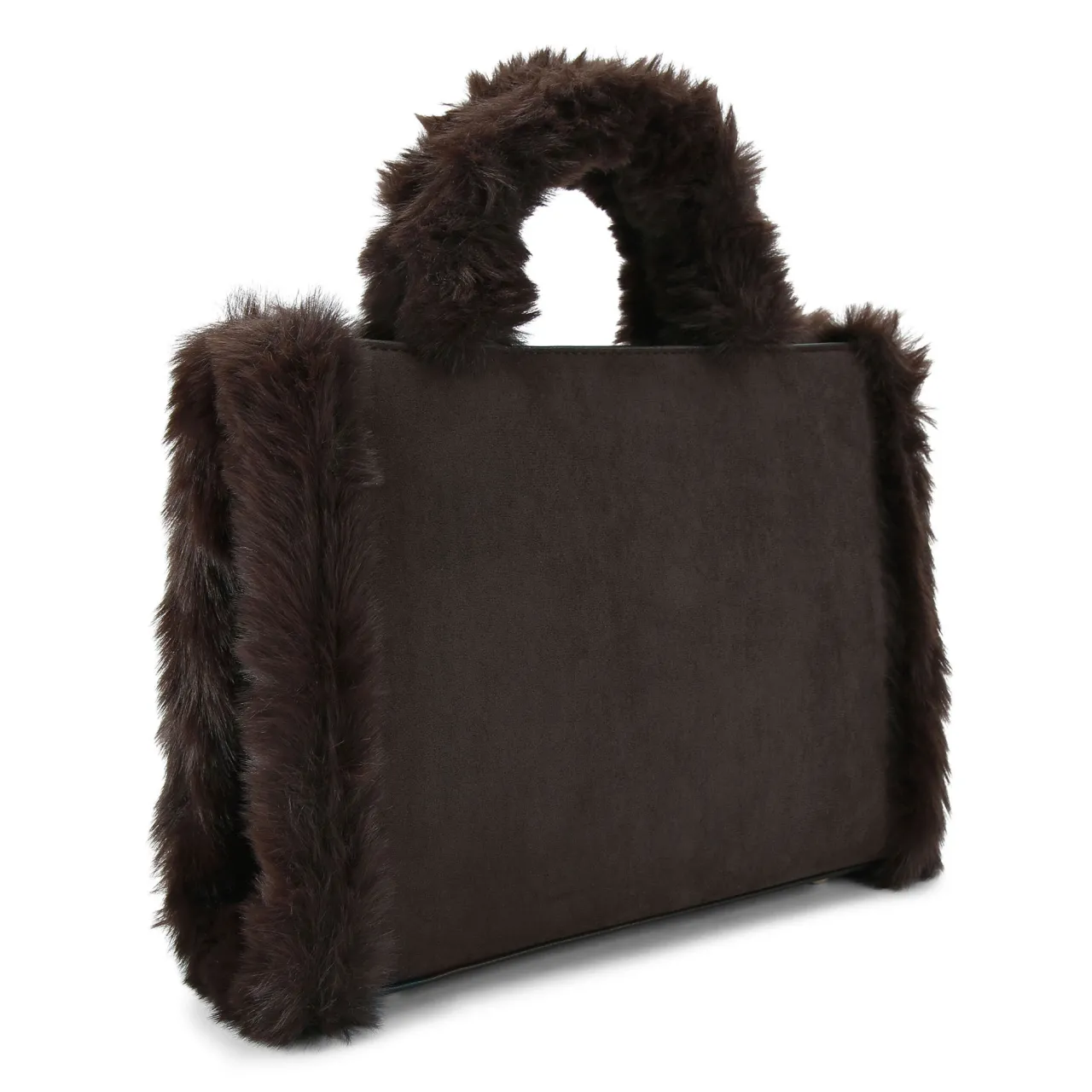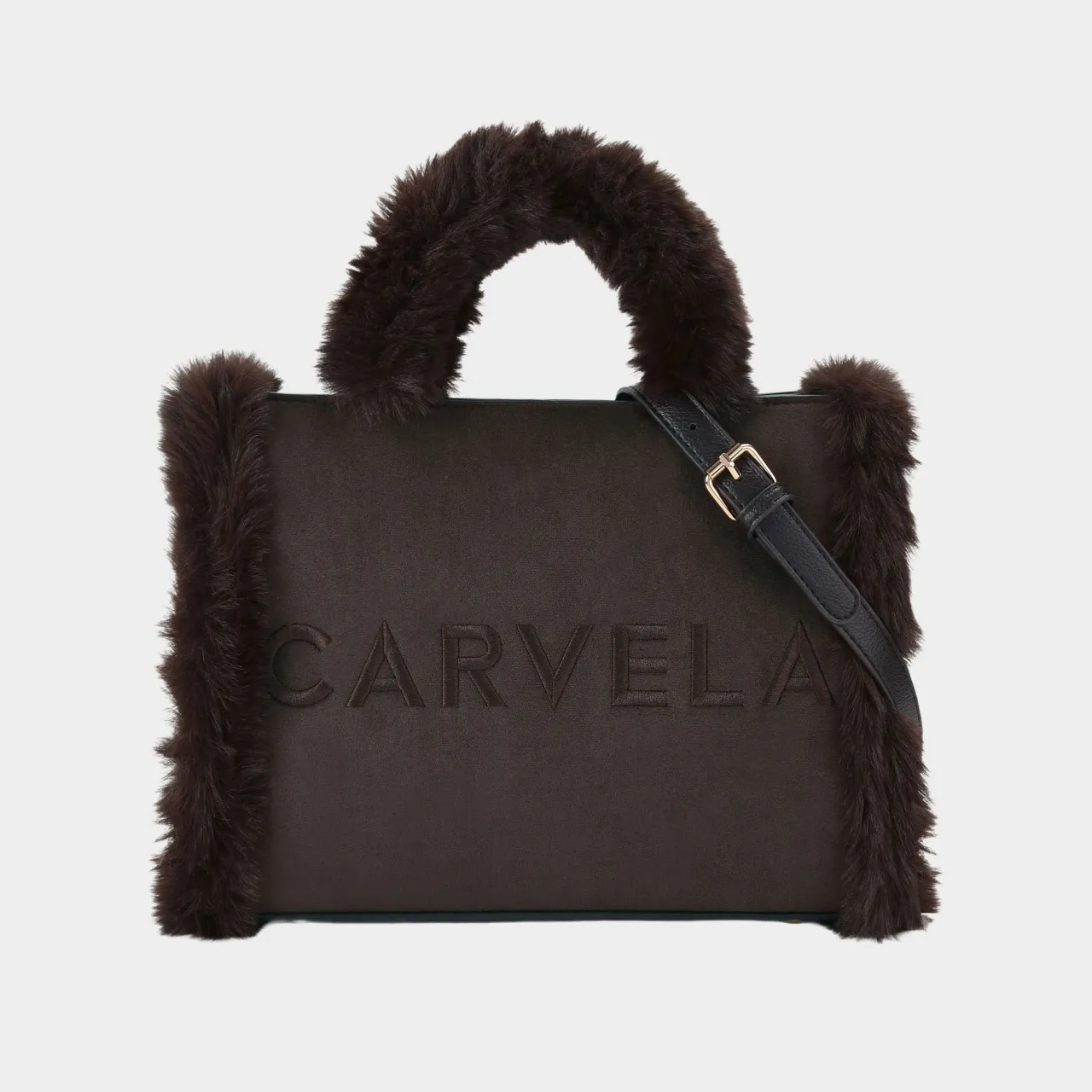 - Midi tote silhouette, microsuede design, faux Borg lining, embossed logo