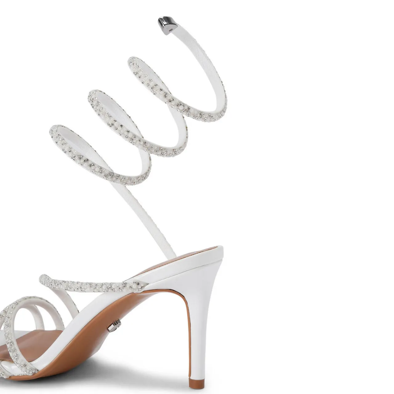 - Spiral heel, slip-on style, open toe design, stiletto heel, flattering white crystal embellished strap which wraps around the ankle, features All Day Long Technology