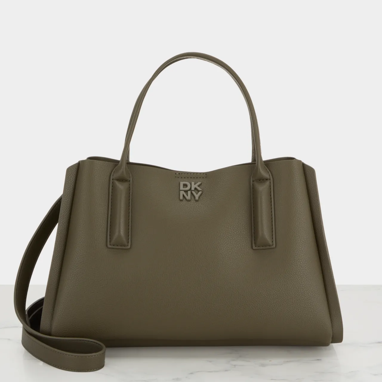 - Top carry handles, crossbody strap, tonal logo details, tab and magnetic button closure, silver-tone hardware