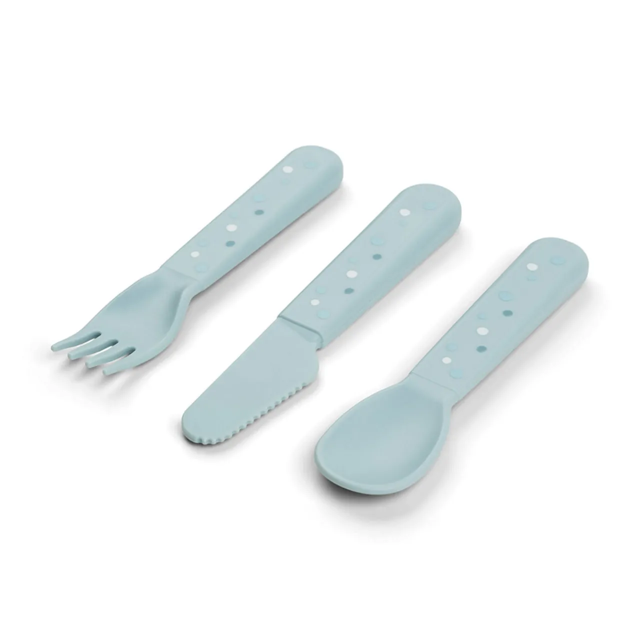- Set of three, include one knife, fork and spoon, happy dots pattern, soft rounded edges, well-dimensioned for little hands