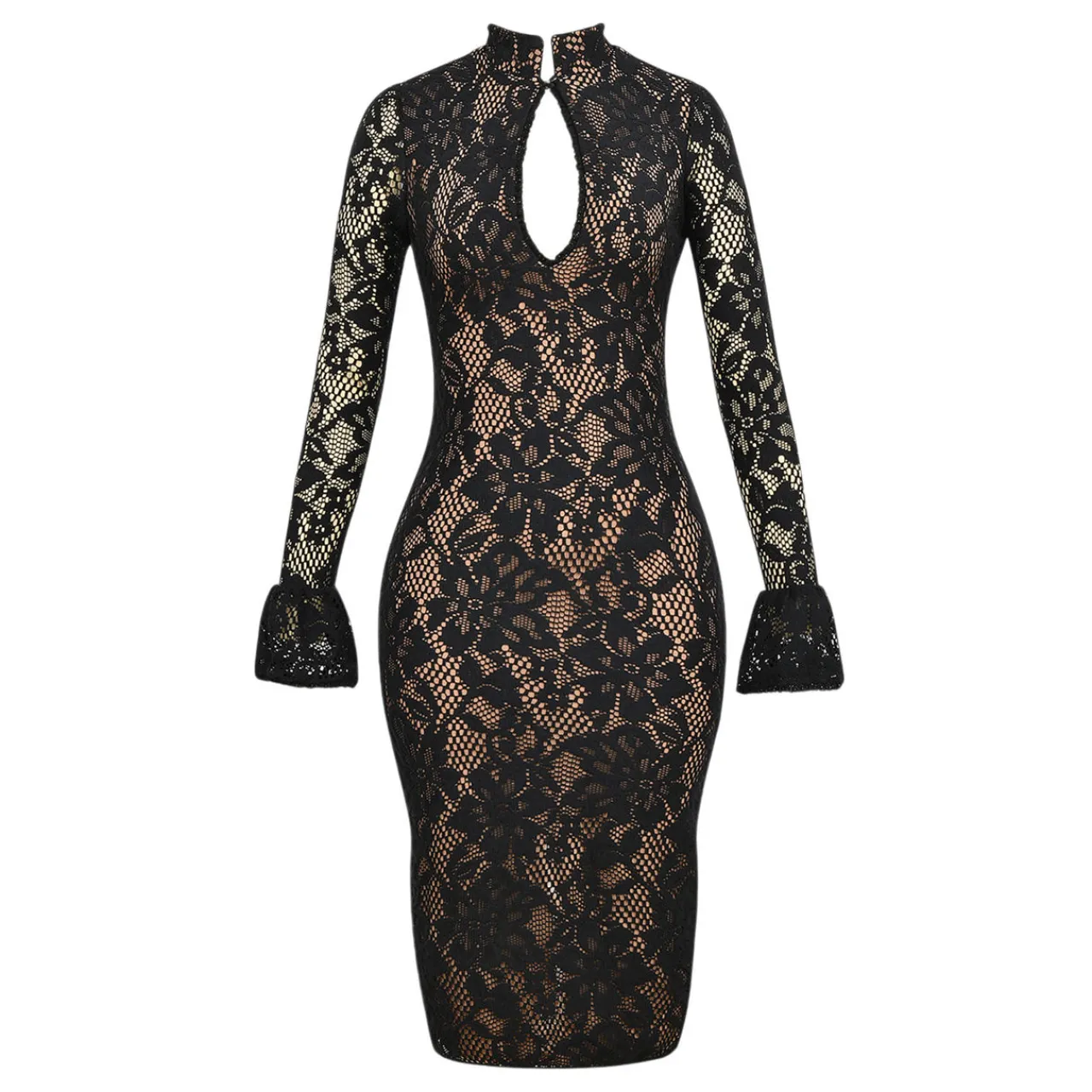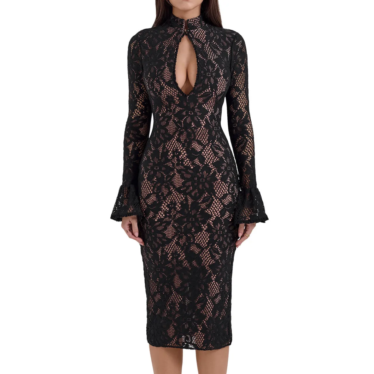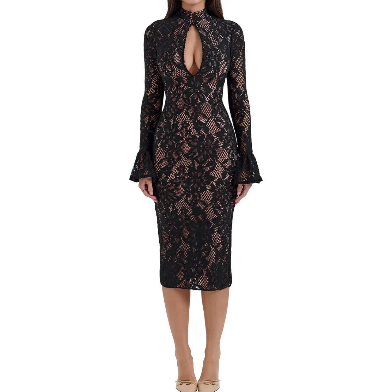- Lace overlay, long sleeves, flared bell cuffs, keyhole detail, high band collar neckline, figure-hugging silhouette, midi length, mesh lining, stretch-fused fabric, reverse slit