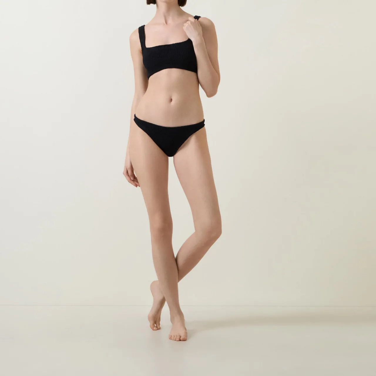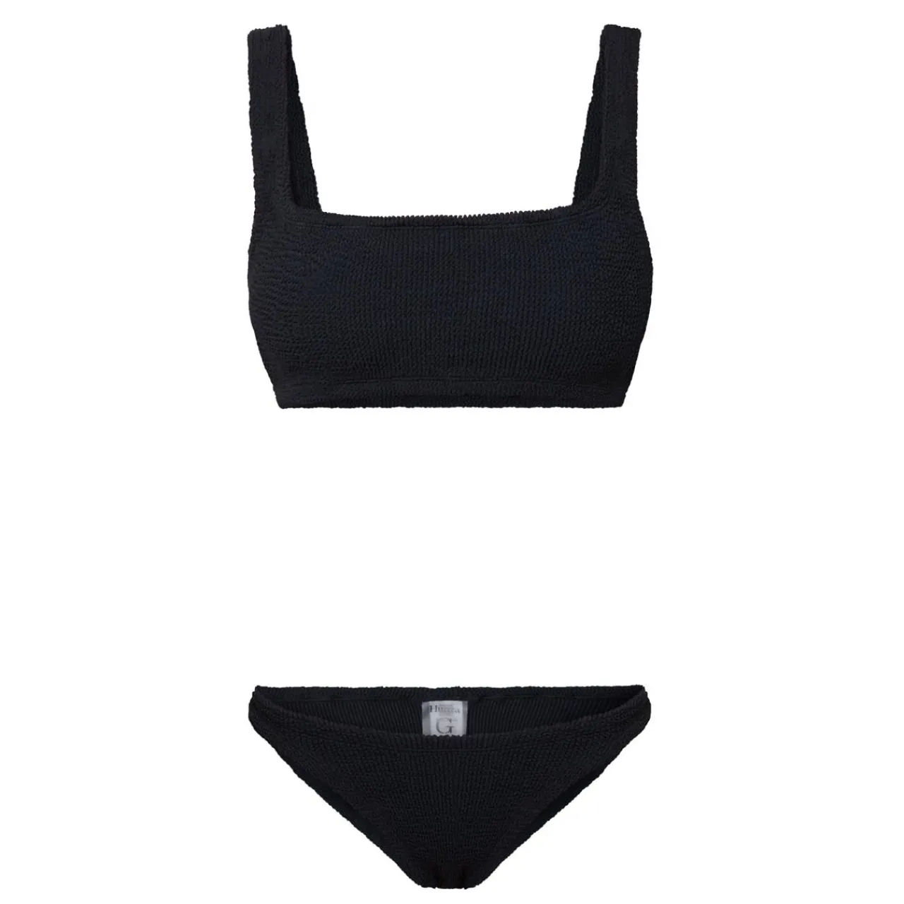 - Close fit, shoulder straps, high-rise bottoms, square neck, ribbed finish.