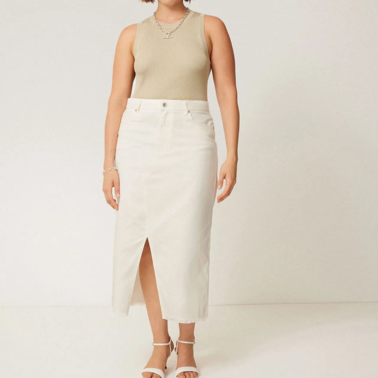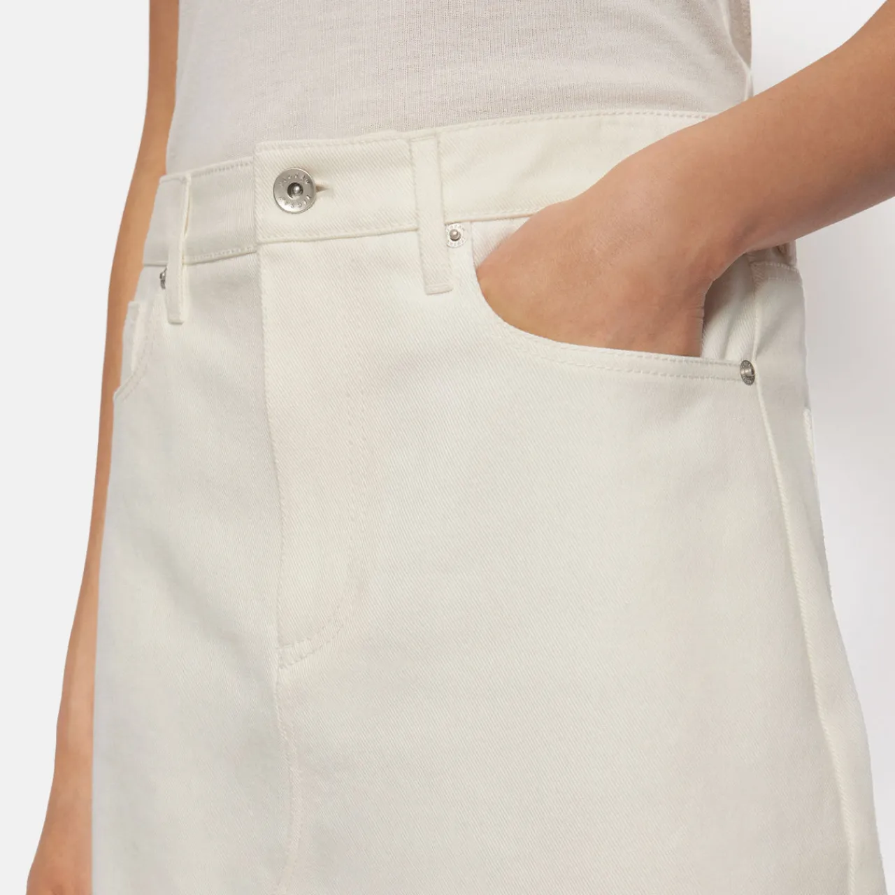 - Denim fabric, front split, frayed hem, five-pocket style, concealed fly, button fastening, belt loops
