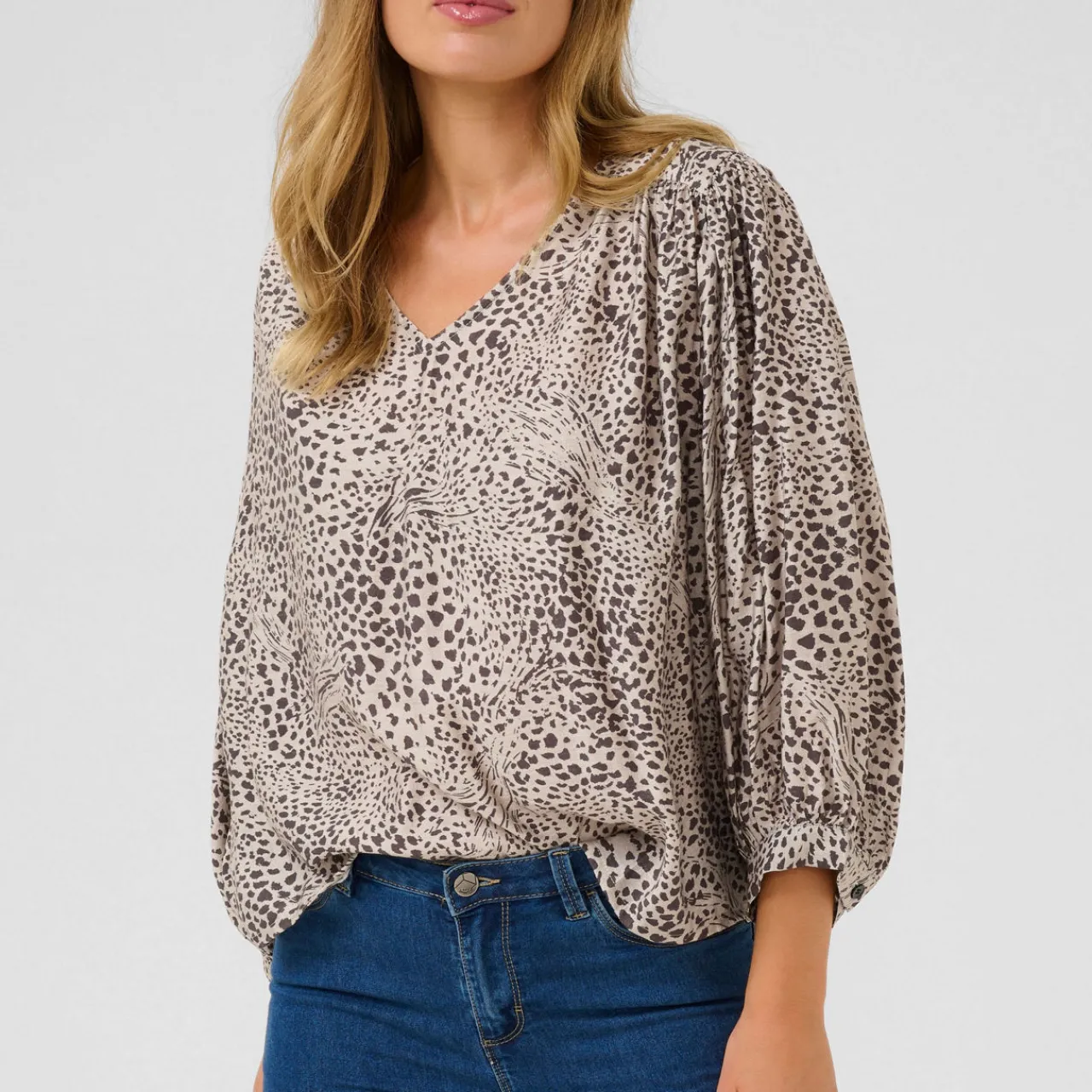 - Abstract leopard print, woven, three-quarter-length sleeves, V-neckline