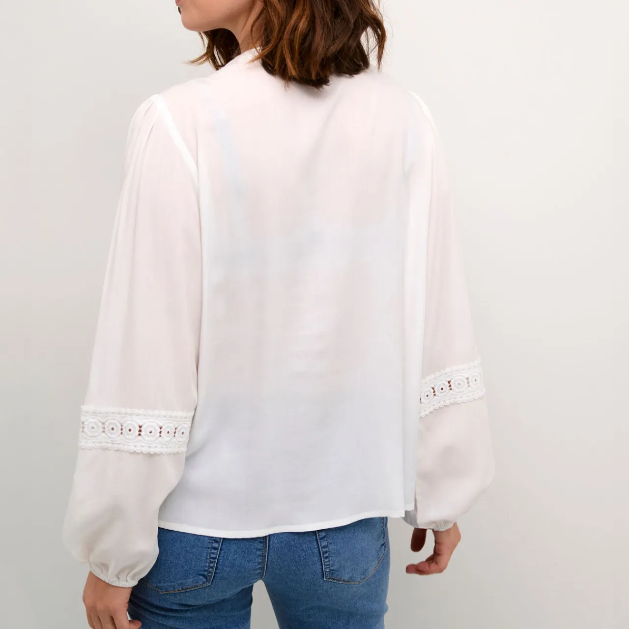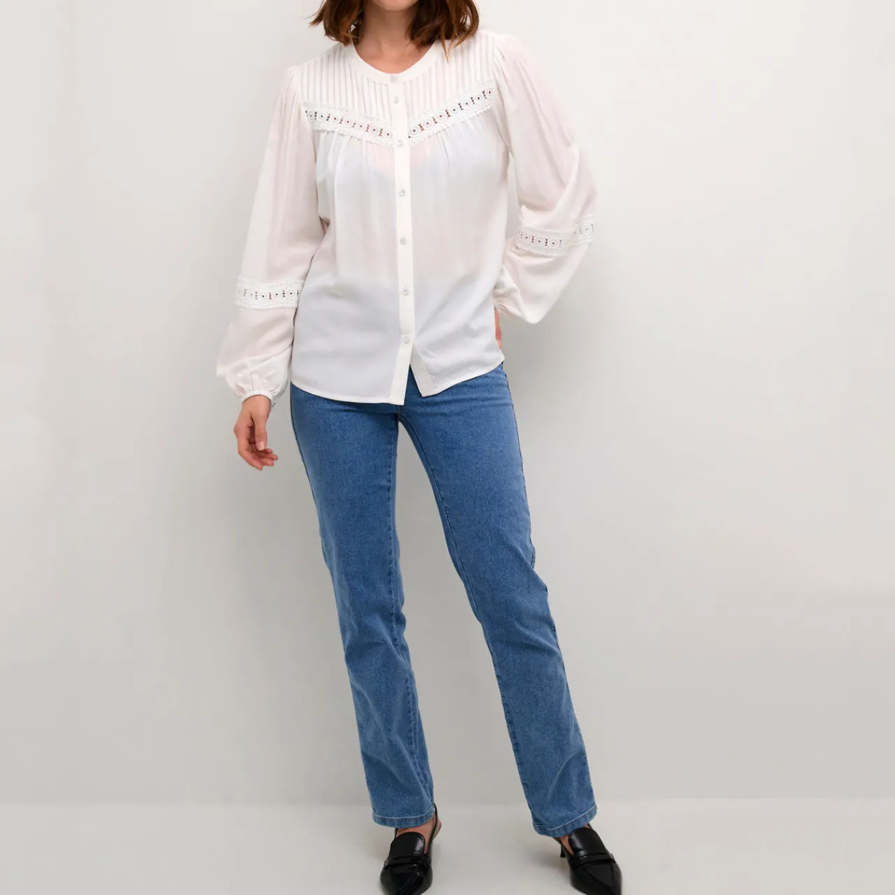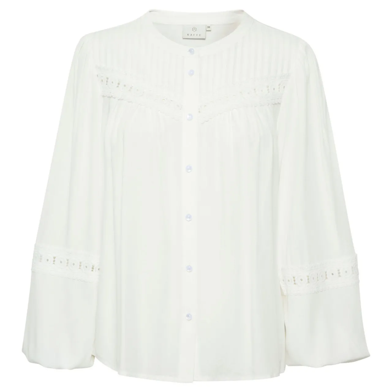 - Round neckline, front button fastening, striped front yoke, lace insert detailing, long bishop sleeves, elasticated cuffs